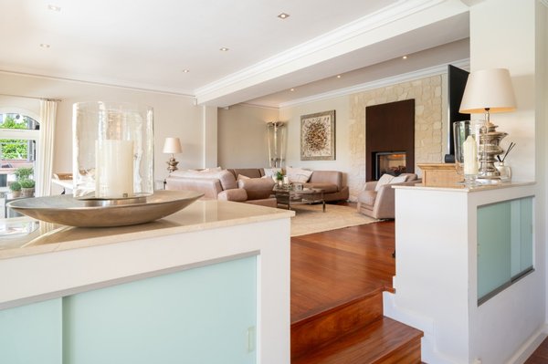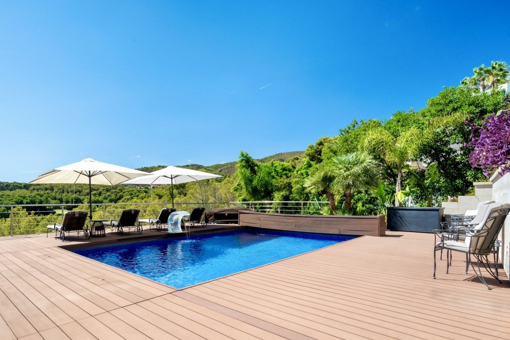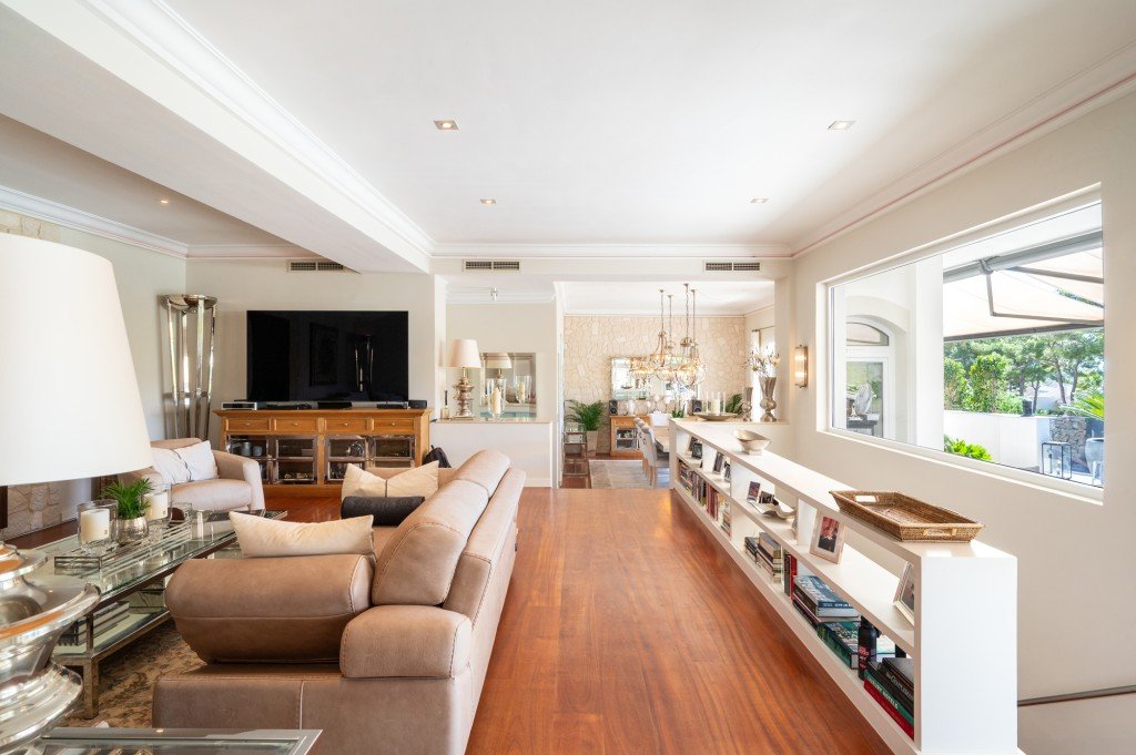 Im Obergeschoss befindet sich das Herzstück des Hauses: ein rund 67 m2 großer Wohn- und Essbereich mit Kamin und bodentiefen Fenstern, die sich zur sonnenverwöhnten Terrasse mit elegantem Poolbereich öffnen. Von hier aus fällt der Blick hinaus auf den Golfplatz.