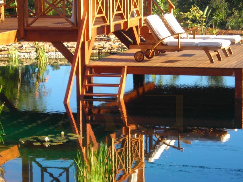 Neben der fantastischen Holzterrasse, die direkt neben dem 9 m hohen Wasserfall und dem Koi-See liegt, gibt es auf der Hauptterrasse auch eine freistehende, überdachte Holzbalkenpergola mit Markisen und Blick auf den Pool und den Garten, die auch für stilvolle Unterhaltung und Mahlzeiten im Freien genutzt wird.