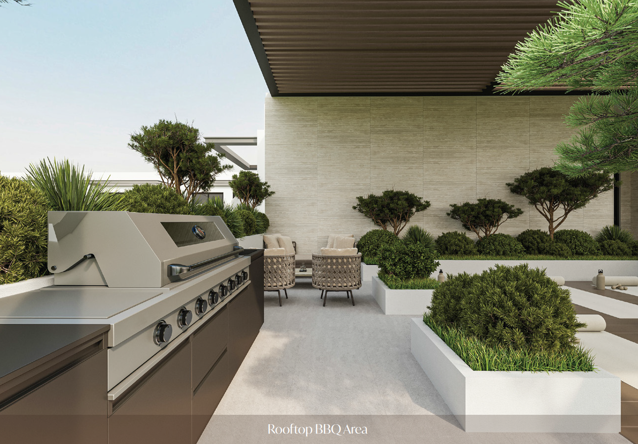 Die Küche ist mit modernsten Geräten ausgestattet, ideal für Hobbyköche, die gerne ihre kulinarischen Fähigkeiten unter Beweis stellen. Treffen Sie Freunde und Familie zum Grillen in den BBQ-Zonen oder entspannen Sie am Resort-Style-Pool, umgeben von Palmen und Sonnenschirmen.