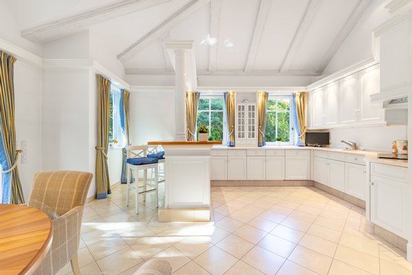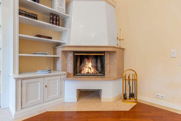 Der offen gestaltete Wohnbereich mit angrenzender Küche bildet das Herzstück der Wohnung. Von hier aus gelangen Sie direkt auf die großzügige Westterrasse, die sich ideal für gesellige Abende und Sonnenuntergänge eignet. Ein stilvoller Kamin im Wohnzimmer sorgt an kühleren Tagen für eine behagliche Atmosphäre und gemütliche Stunden.