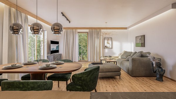 •1 Penthouse mit ca. 146 m² Wfl. – Lift direkt in die Whg., Diele, riesiger Wohnsalon mit Kamin und Küche, 3 Schlafzimmer, 2 Bäder, WC, Ankleide und Sauna sowie extrem große Dachterrasse, 2 PKW-Carport-Stellplätze.
