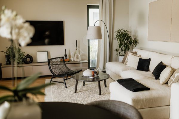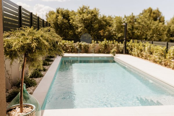Das 350 m² große Grundstück ist sorgfältig angelegt. Rasenflächen, ein Olivenbaum und Hecken schaffen eine grüne Oase. Mittelpunkt ist der private Pool mit Sonnenterrasse. Hier entspannen Sie oder verbringen Zeit mit Familie und Freunden. Die überdachte Terrasse von 19 m² bietet Platz für einen großen Esstisch. Ergänzt wird das Angebot durch einen Grillbereich für gesellige Abende im Freien.