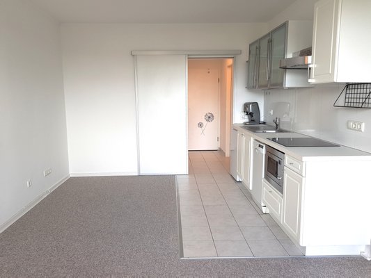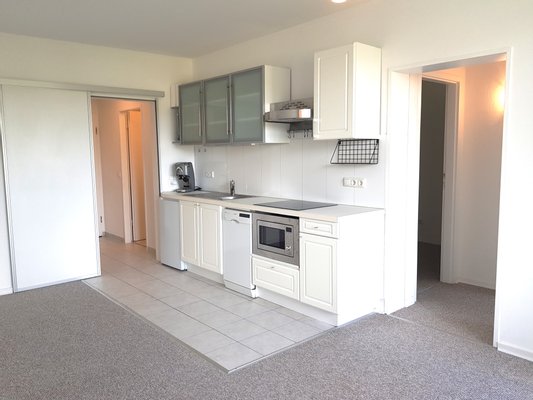 Die angebotene Wohnung liegt im 2. Obergeschoss in dem abgebildeten Mehrfamilienhaus mit einer Wohnfläche von ca. 44 m².   Zur Wohnung gehören der Flur, ein Wohnzimmer mit Ess- und Küchenbereich, ein Schlafzimmer, ein großer begehbarer Schrankraum, das Badezimmer mit kleiner Sitzwanne und WC und eine schöne Süd-Loggia. Bei der Küche handelt es sich um eine komplette Küchenzeile (Pantry). Die Einrichtung wurde sehr geschmackvoll aufeinander abgestimmt.