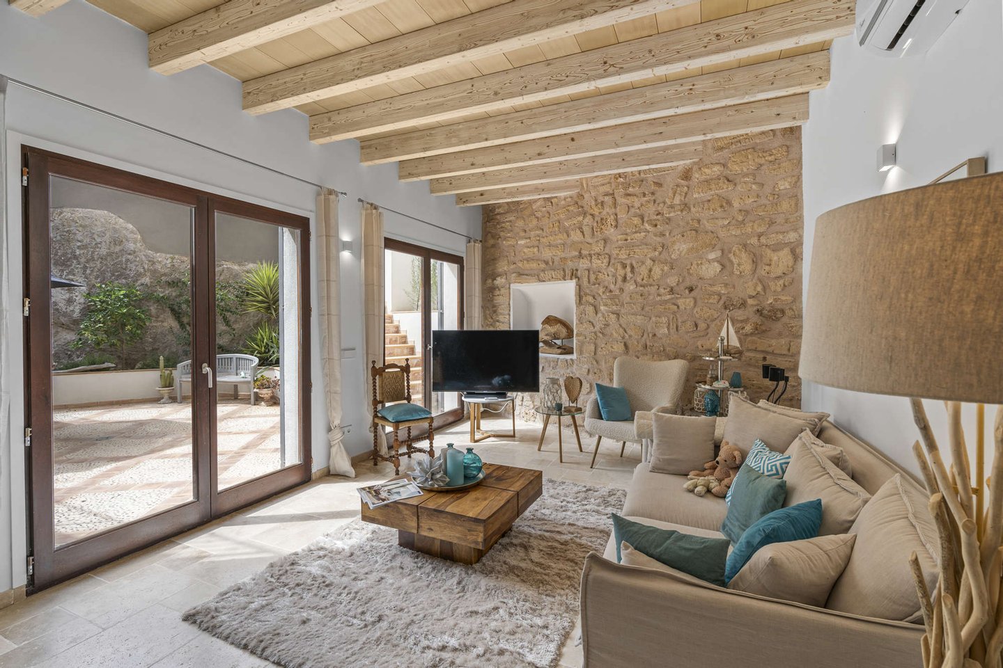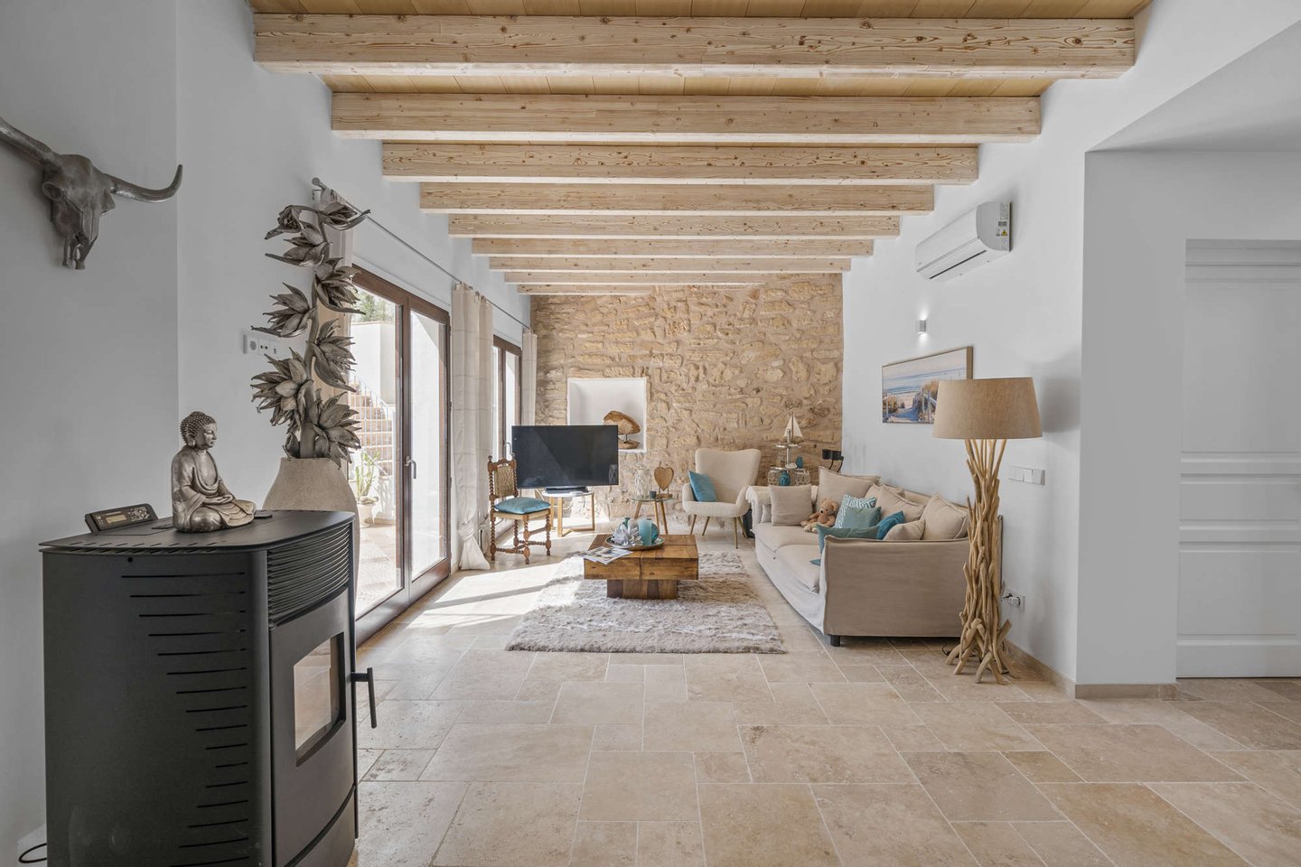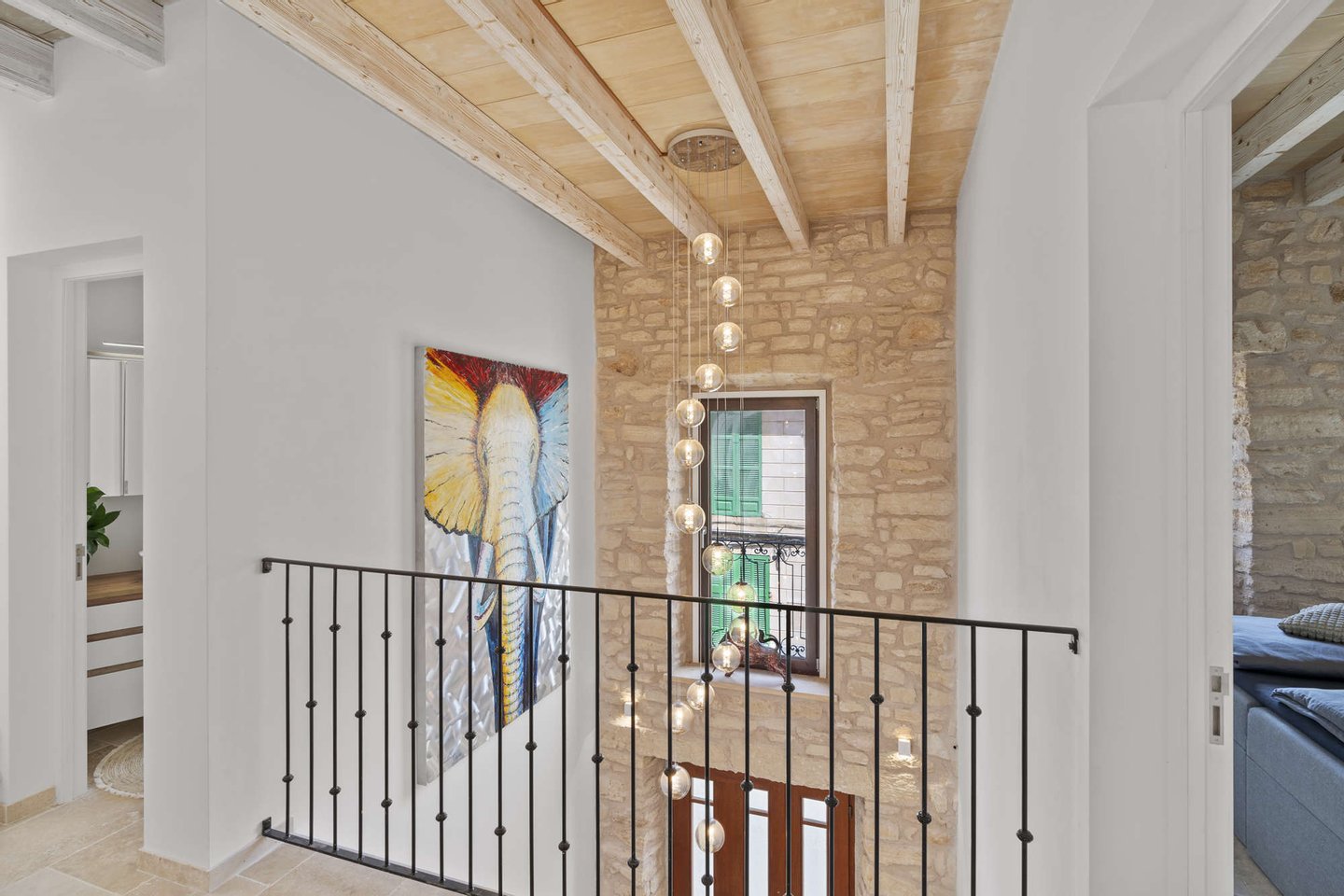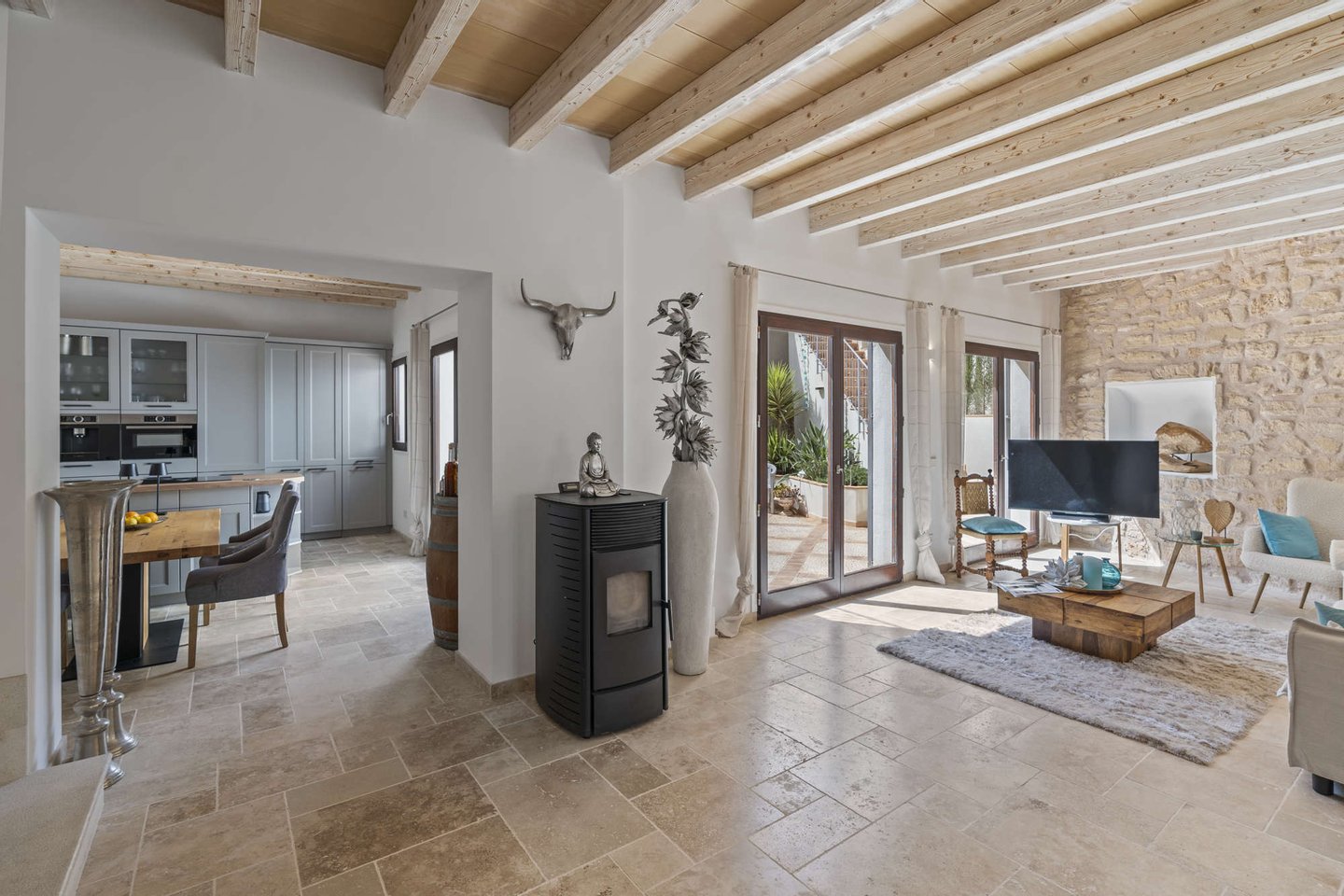 * Mallorquinisches Flair durch Holz-Deckenbalken und Steinverkleidungen der Wände