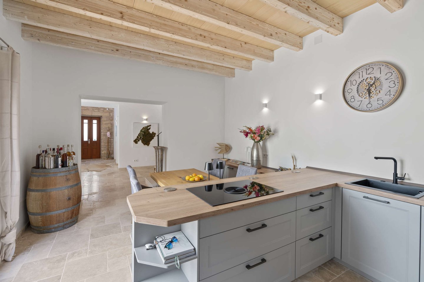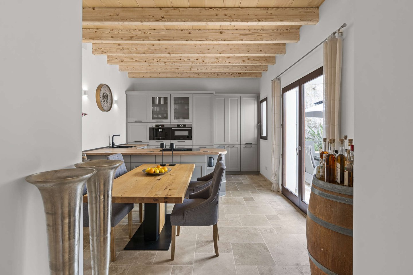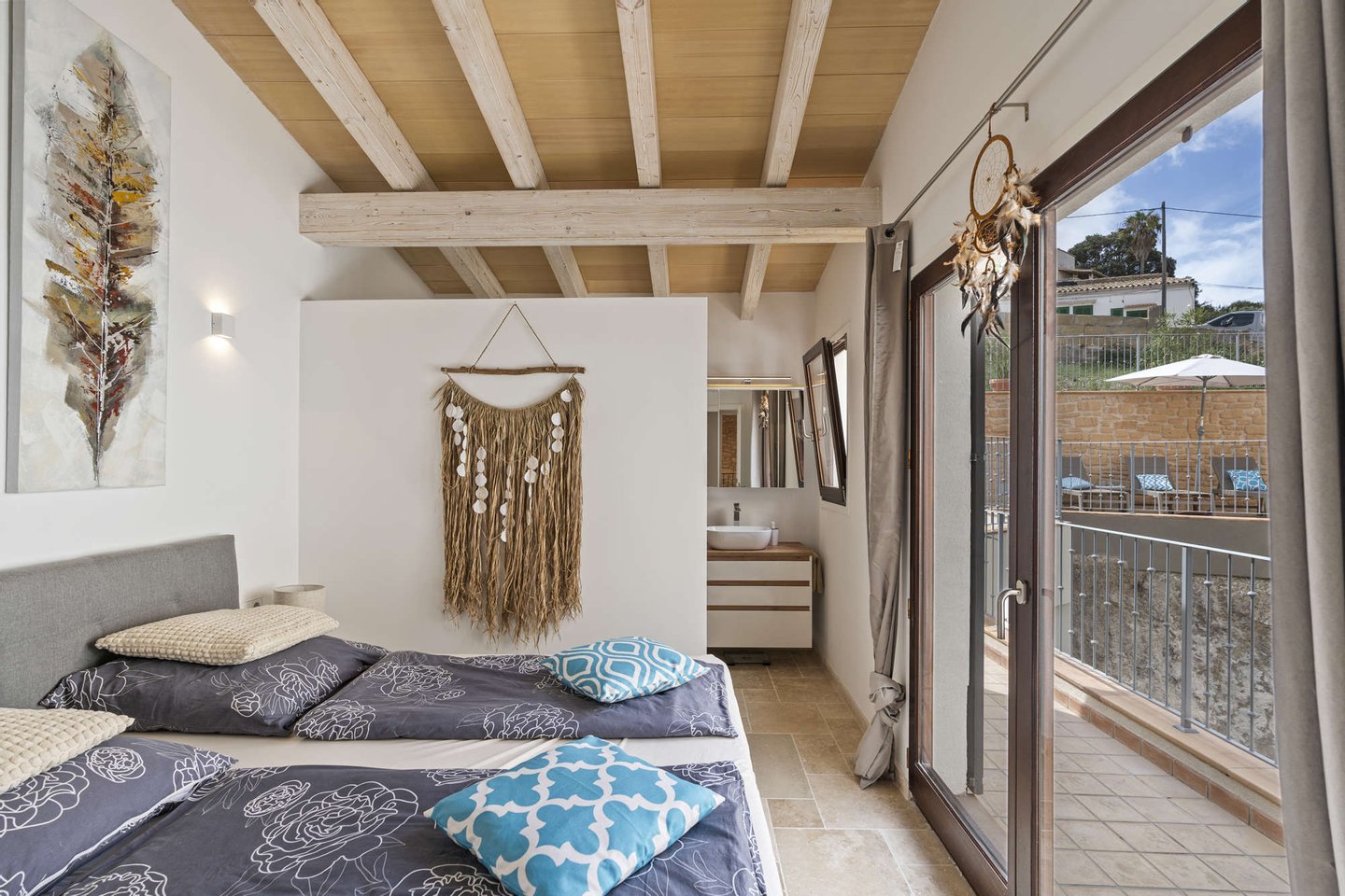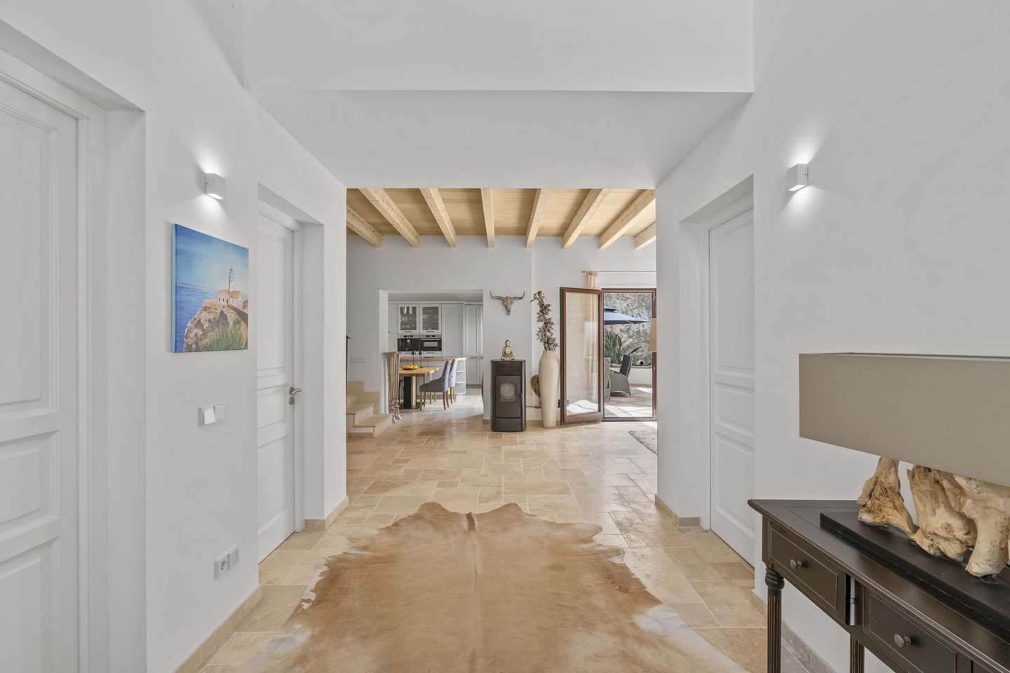 * Mallorquinisches Flair durch Holz-Deckenbalken und Steinverkleidungen der Wände