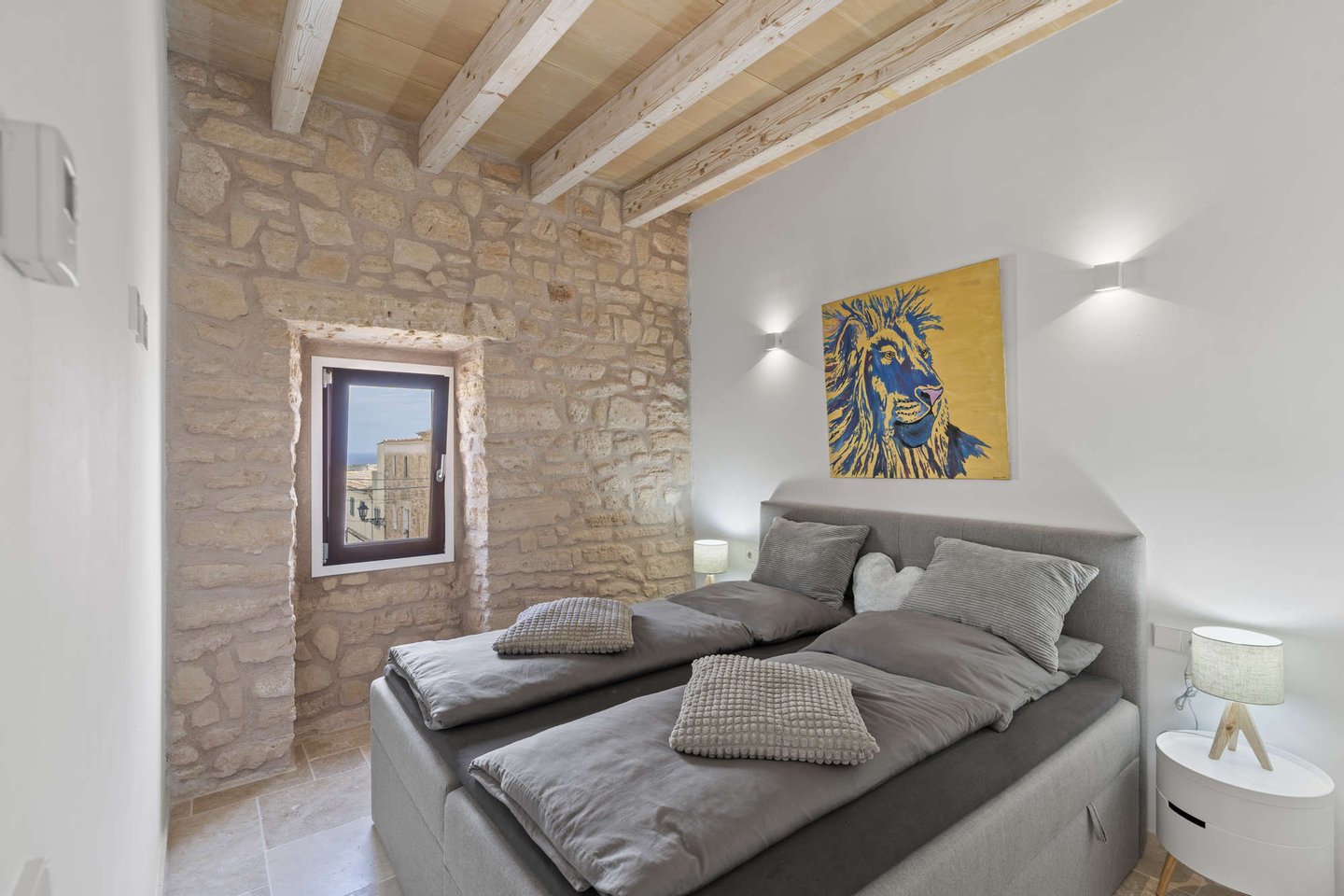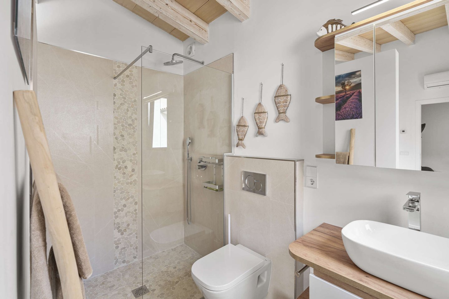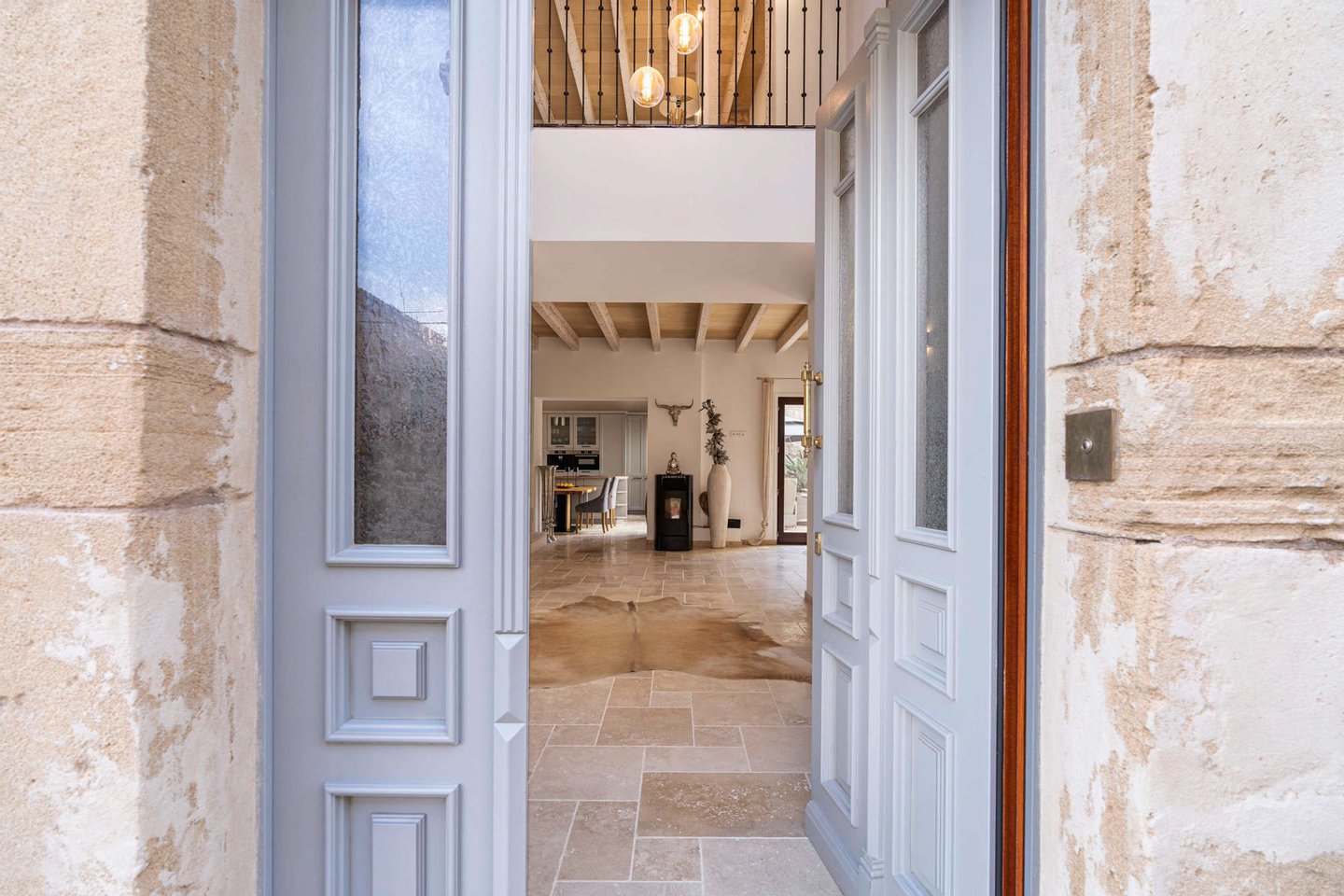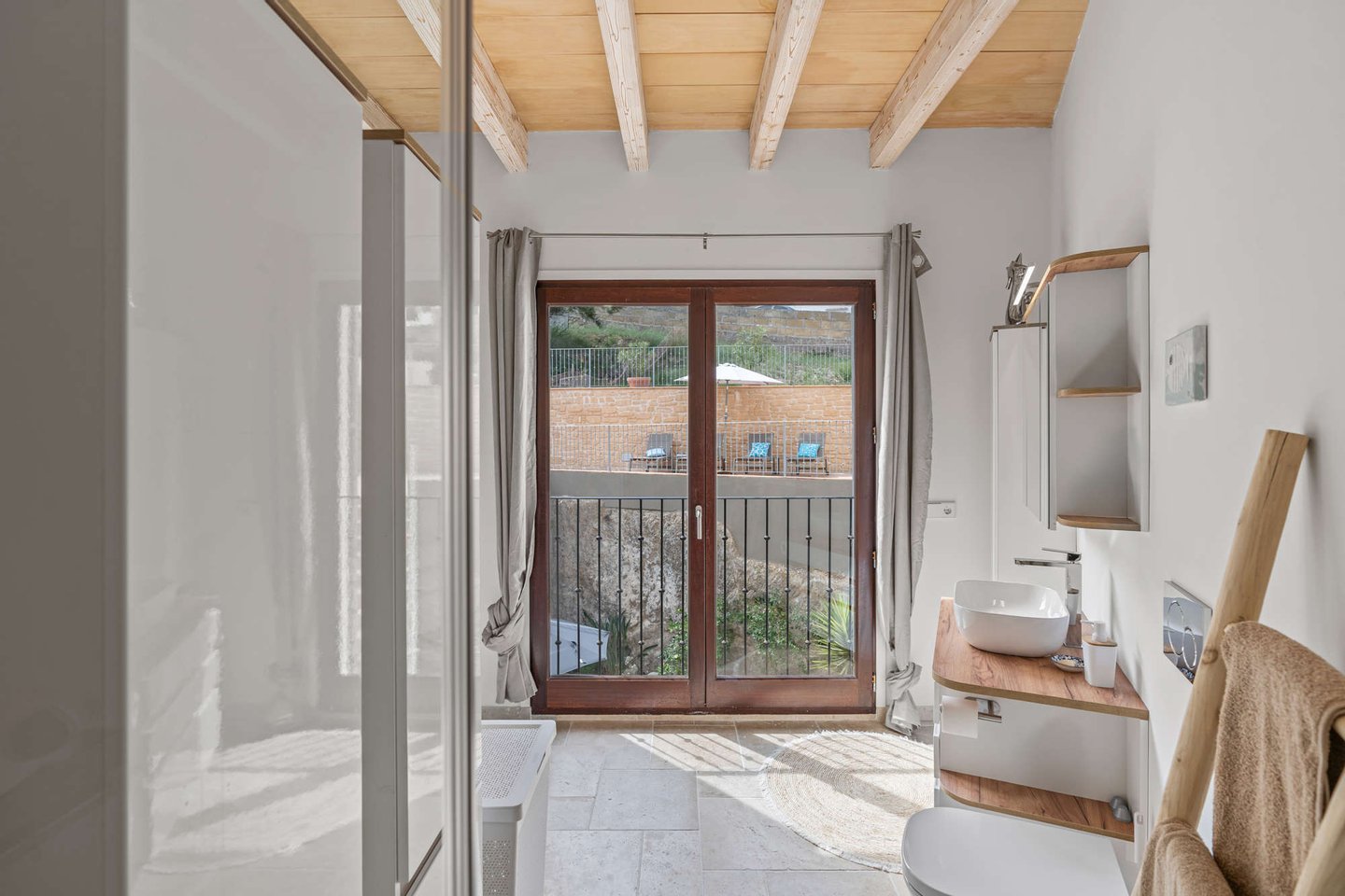 * Mallorquinisches Flair durch Holz-Deckenbalken und Steinverkleidungen der Wände