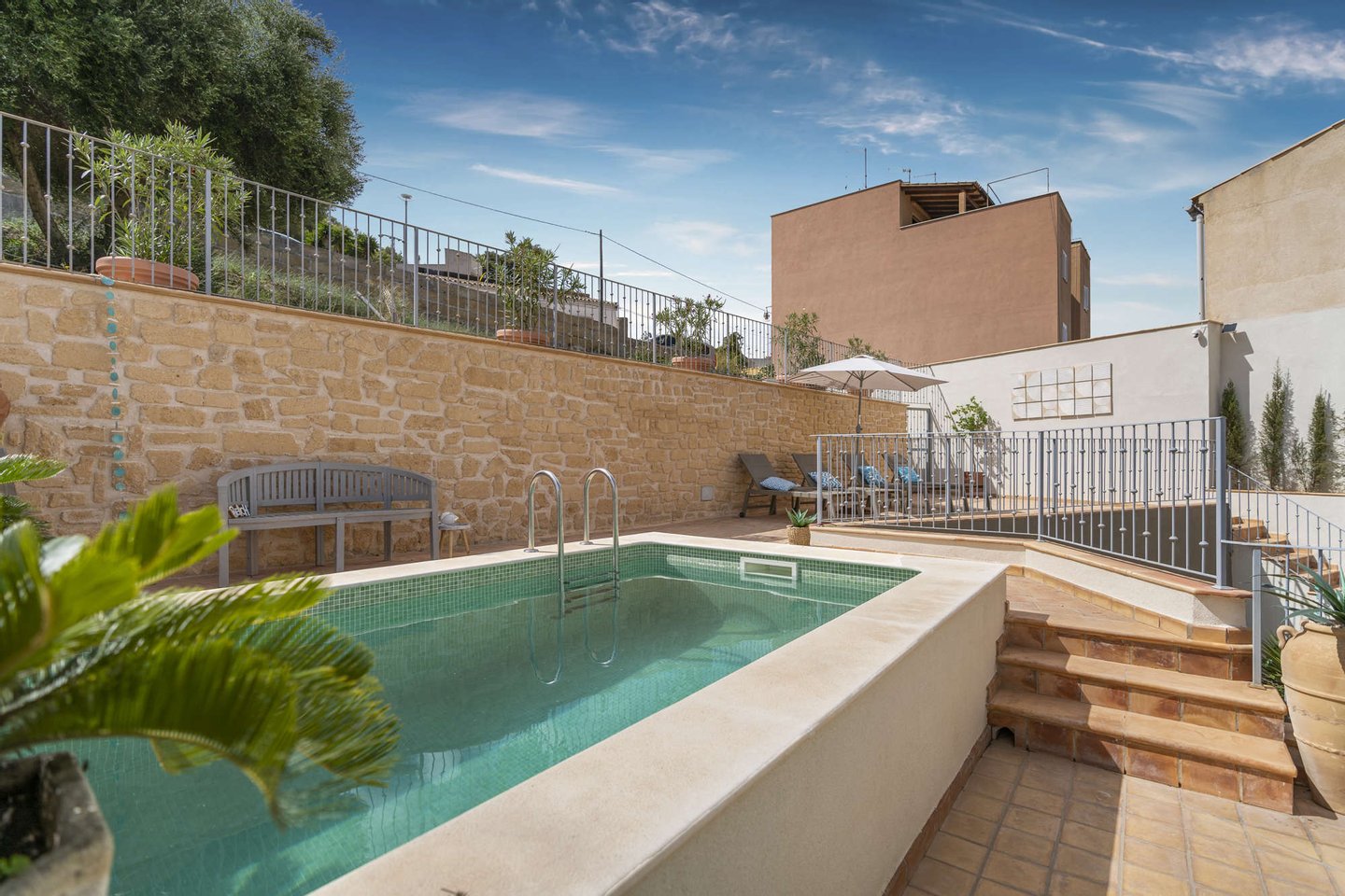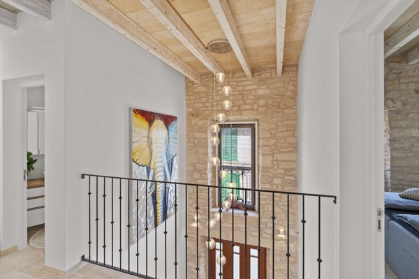 Über eine steingehämmerte Treppe erreicht man die 1.Etage mit 3 Schlafzimmern, 3 Badezimmern (2 davon en Suite) und eine elegante Galerie mit Blick hinunter in den Eingangsbereich. Auf dieser Ebene befindet sich im Außenbereich der erfrischende Pool und lauschige Sitzecken mit der Option eine Doppelgarage und eine weitere Terrasse zu gestalten.