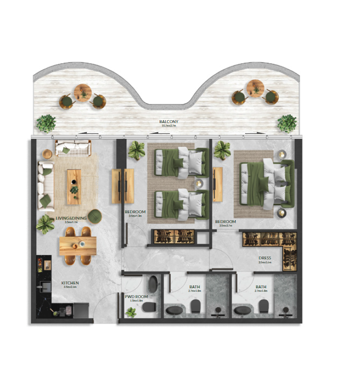 Willkommen in Ihrem neuen Zuhause! Treten Sie ein und lassen Sie sich von den luxuriösen Möglichkeiten dieser beeindruckenden 2-Zimmer-Wohnung begeistern. Die Family Seating Decks laden zu gemütlichen Abenden im Freien ein, während der Poolside