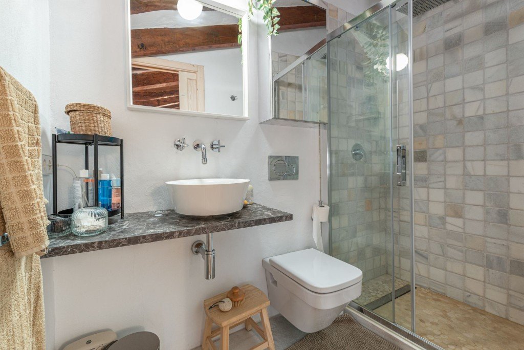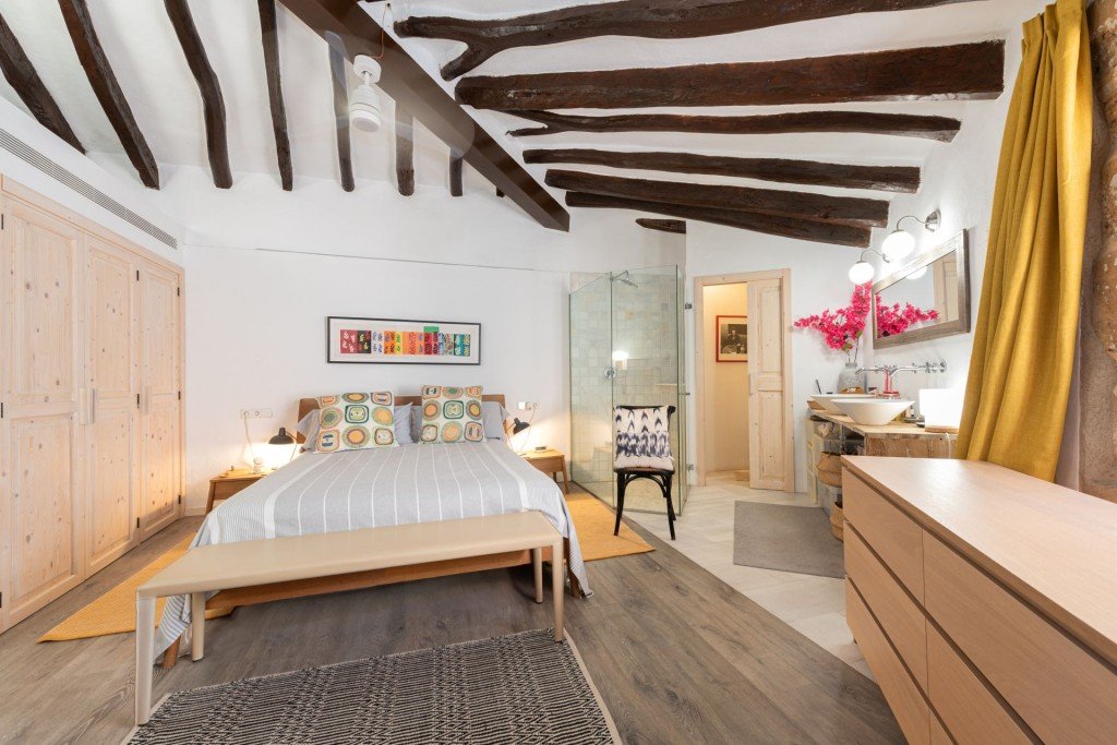 Es gibt vier Doppelschlafzimmer, jedes mit eigenem Bad, einschließlich des Hauptschlafzimmers, das sich auf der Rückseite des Hauses befindet und einen Balkon mit Blick auf den Puig de Maria bietet.