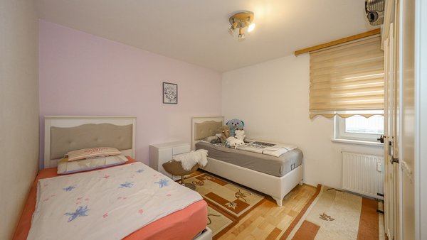 Die Wohnung teilt sich wie folgt auf: Eingangsbereich mit Garderobe, welche in den Flur mündet. Großes Wohnzimmer, separate Küche mit Essbereich und Abstellraum, zwei Schlafzimmer, ein Bad mit Badewanne, Waschtisch und Waschmaschinenanschluss sowie ein separates WC.