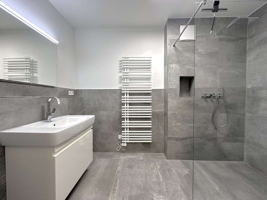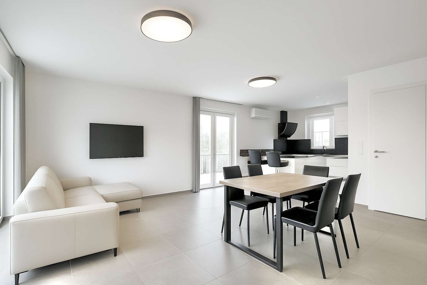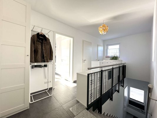 Die puristische Kastenmarkise sorgt für eine moderne Optik, während alle Wohnräume im gleichen Fliesendesign gehalten sind. Der Abstellraum bietet Platz für eine Waschmaschine und einen Trockner, sowie ein Serverrack. Mit Smart Home-Funktionen ( Kat7 ) wie elektronisch gesteuerter Fußbodenheizung, Wohnungstüröffnung per App und App-gesteuerte Klimaanlagen wird Ihr Leben noch komfortabler.