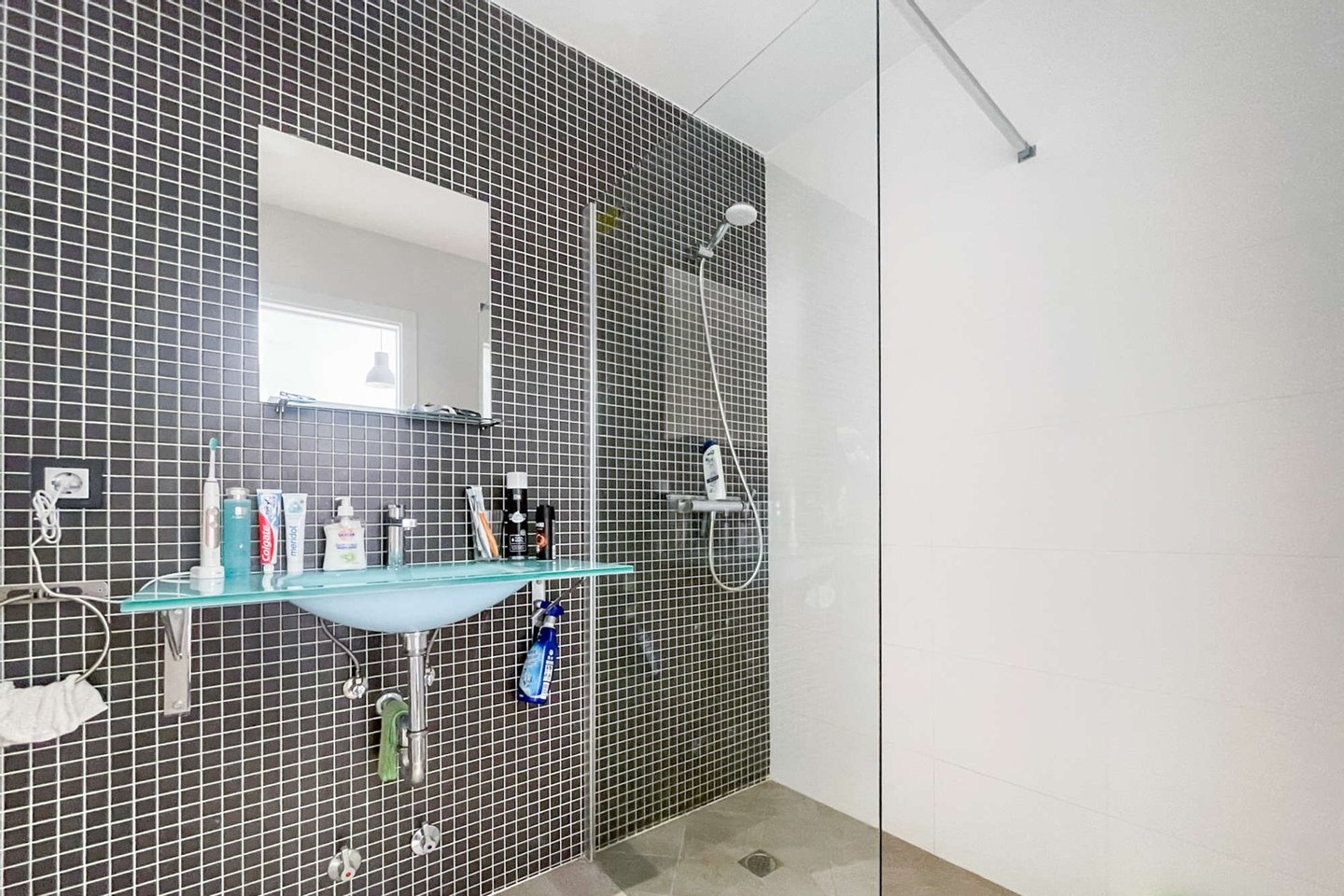 Badezimmer: Die beiden Badezimmer im Obergeschoss sind mit begehbaren, großen Duschen ausgestattet und bieten höchsten Komfort und eine moderne, stilvolle Gestaltung. Im Erdgeschoss befindet sich zusätzlich ein Gäste-WC.