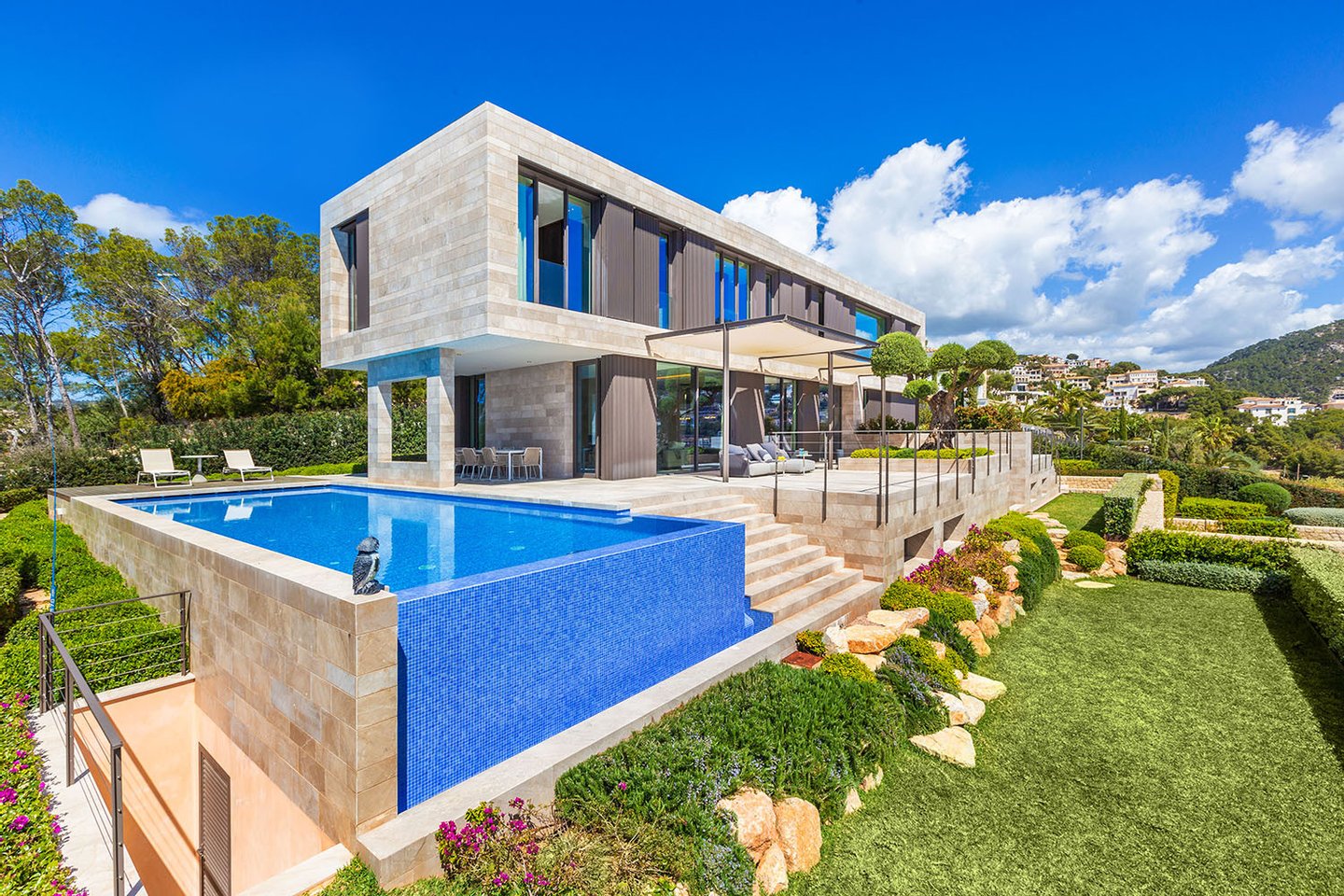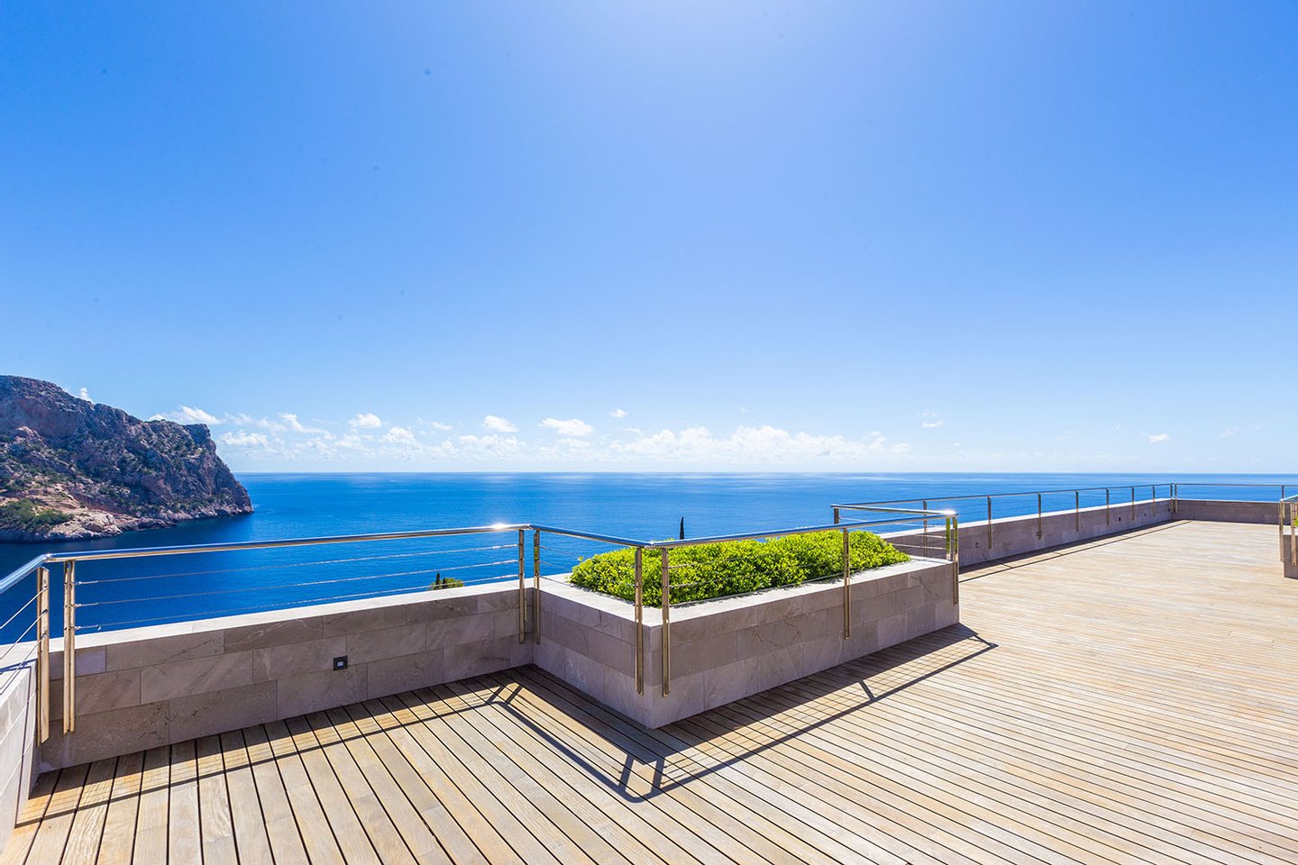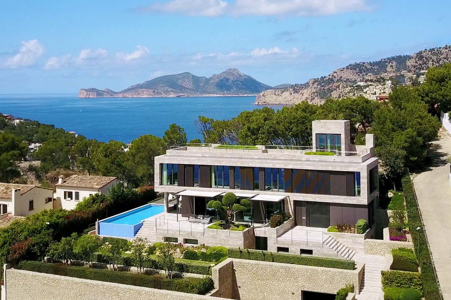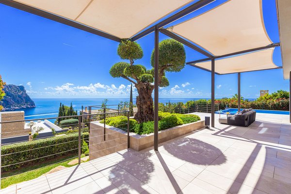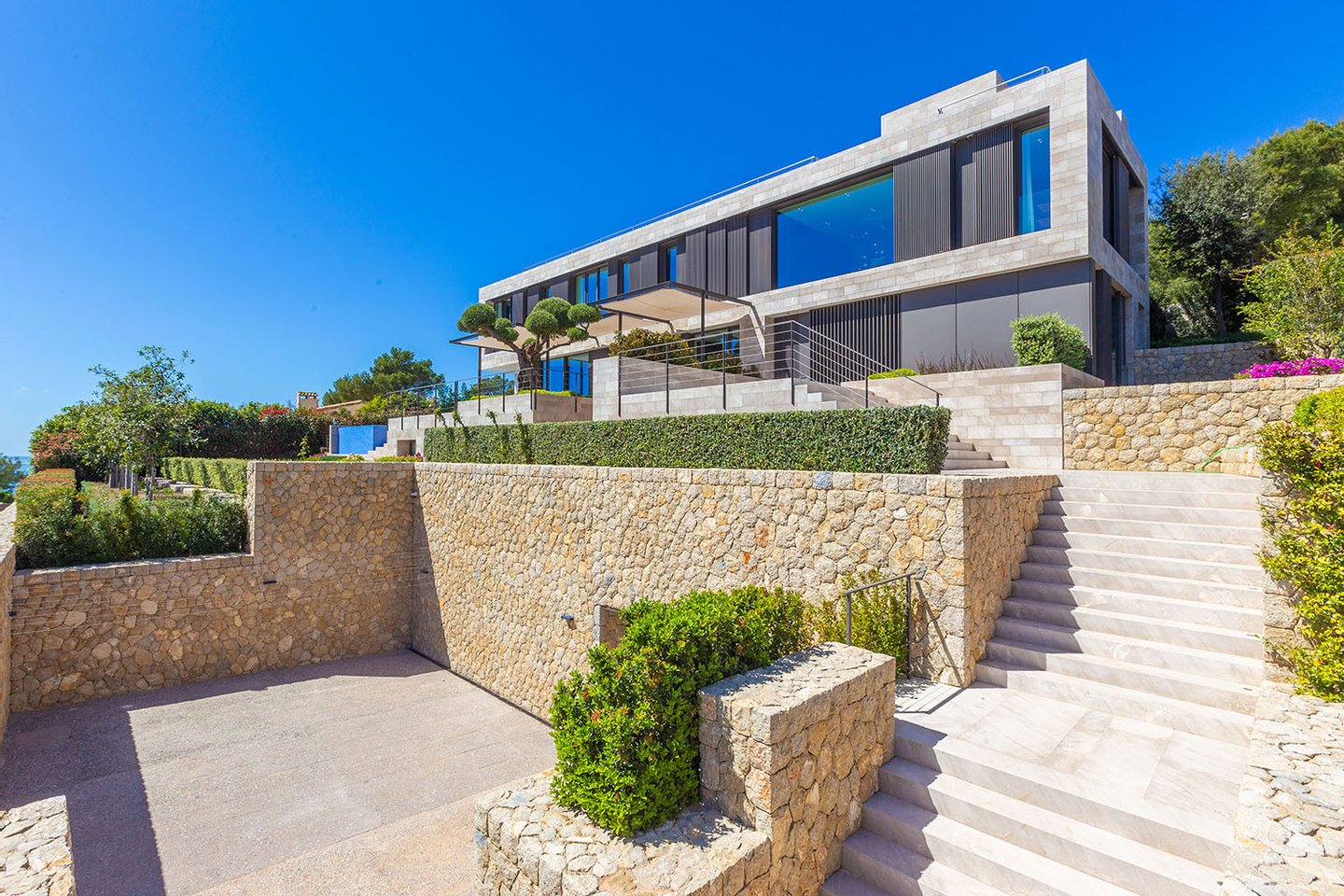 Diese extravagante, moderne Villa befindet sich in 2. Meereslinie, in einer ruhigen Villen- und Apartmentwohnlage oberhalb der Cala Marmacén und lässt in Sachen Qualität und Ausstattung keine Wünsche offen. Modernste Technik und höchste Baustandards bis ins kleinste Detail setzen Maßstäbe der Superlative bei dieser einzigartigen Immobilie. Das südlich ausgerichtete Neubau-Anwesen wurde im modernen Baustil errichtet und bietet auf der Dachterrasse einen herrlichen Panoramablick über die Halbinsel La Mola bis zum Naturpark der Insel Dragonera. Über die großzügige Garage für 6 Fahrzeuge und dem dort befindlichen Aufzug betritt man die Villa. Die erste Etage verfügt über den SPA- und Fitnessbereich mit Sauna, Das Home Cinema und über ein Gästeapartment. Auf der Hauptwohnebene im zweiten Obergeschoß liegen das Wohnzimmer, das Esszimmer mit offener Küche, die Bibliothek, ein Büro sowie der Zugang zur Poolterrasse, wo sich der stilvoll gestaltete Außenbereich mit großzügigen freien und überdachten Terrassen und Infinity-Swimmingpool befinden. Das Master-Schlafzimmer mit Ankleide und Bad en Suite sowie drei weitere Schlafzimmersuiten sind in der darüberliegenden Etage. Das mit Geothermie, Solarpaneelen, spezieller Dämmung, E-Auto Ladestation und Smart Home Technik ausgestattete Anwesen besticht durch Nachhaltigkeit. Großzügige freien und überdachte Terrassen sowie der atemberaubende Meerblick unterstreichen das elegant moderne Ambiente der Villa.