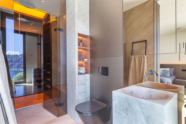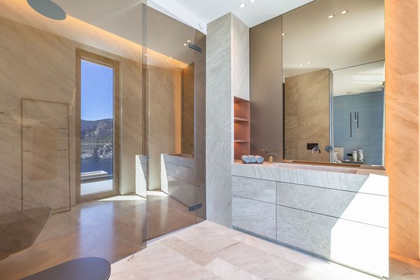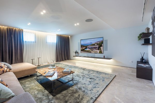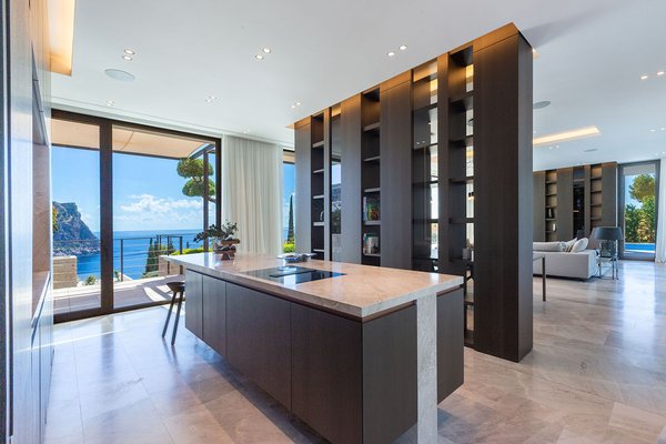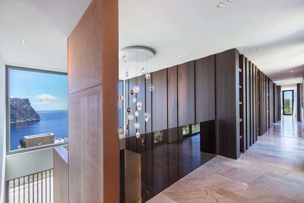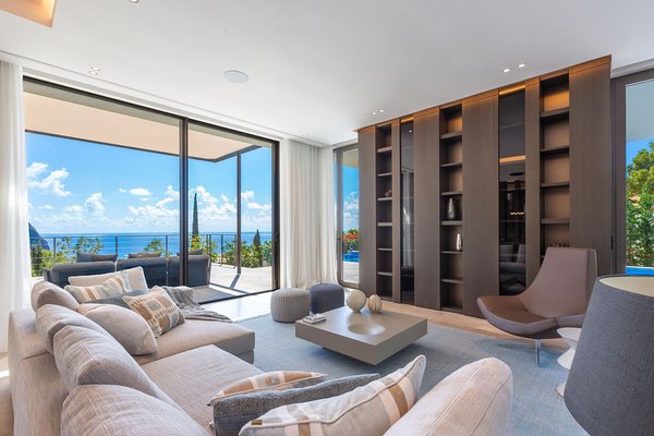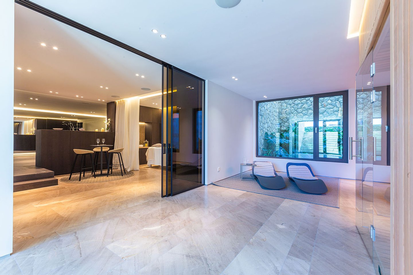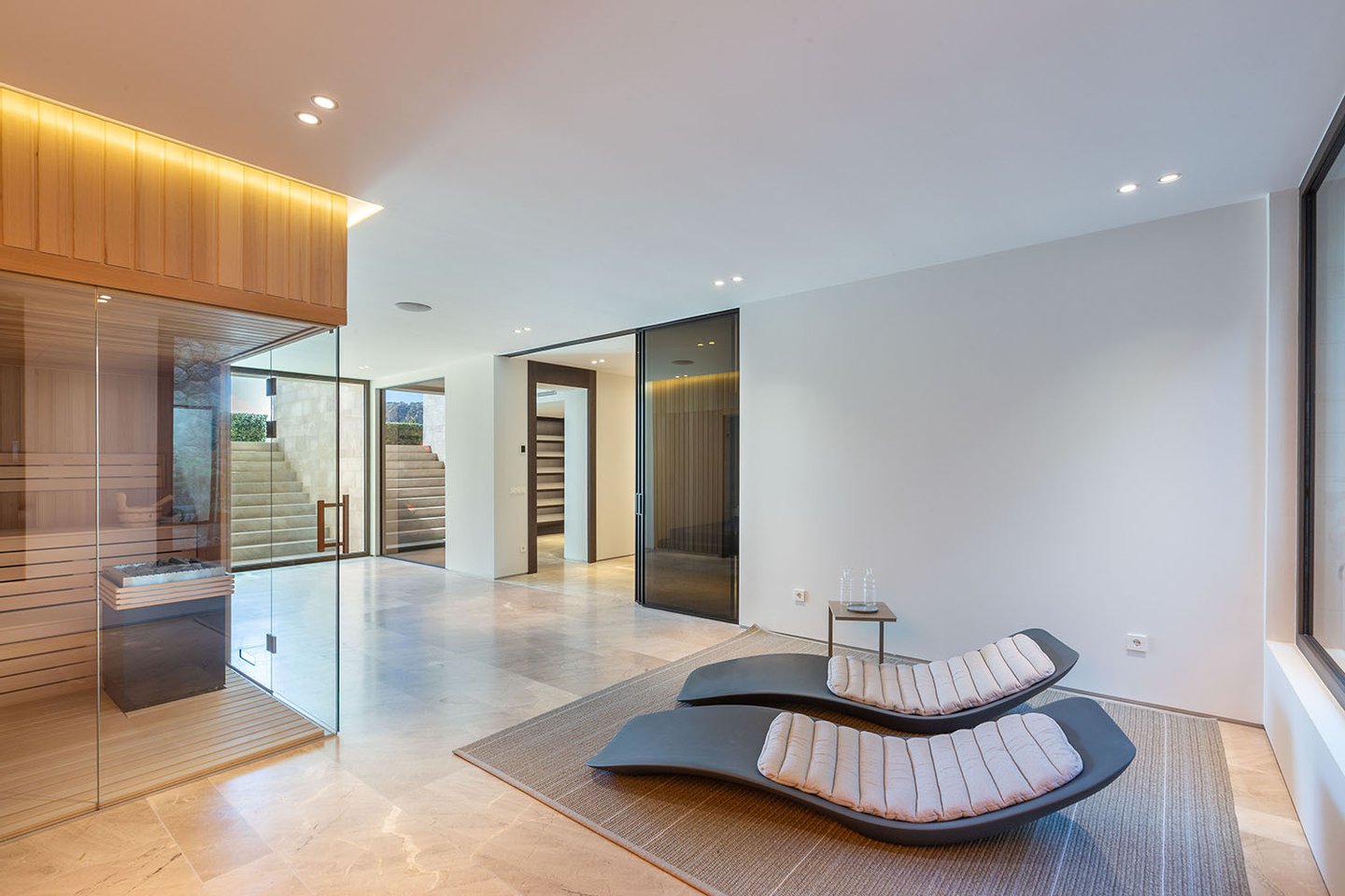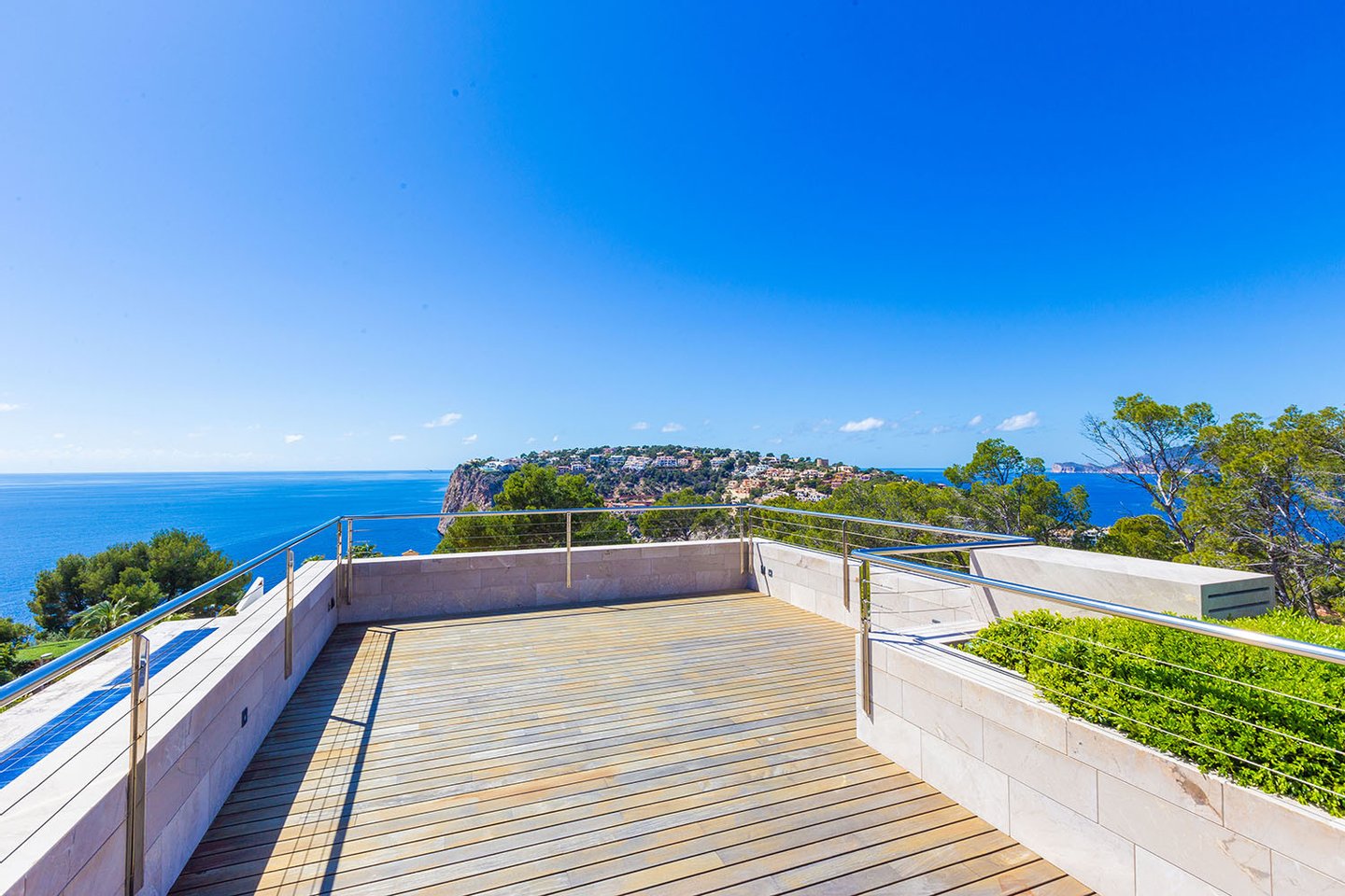 Diese extravagante, moderne Villa befindet sich in 2. Meereslinie, in einer ruhigen Villen- und Apartmentwohnlage oberhalb der Cala Marmacén und lässt in Sachen Qualität und Ausstattung keine Wünsche offen. Modernste Technik und höchste Baustandards bis ins kleinste Detail setzen Maßstäbe der Superlative bei dieser einzigartigen Immobilie. Das südlich ausgerichtete Neubau-Anwesen wurde im modernen Baustil errichtet und bietet auf der Dachterrasse einen herrlichen Panoramablick über die Halbinsel La Mola bis zum Naturpark der Insel Dragonera. Über die großzügige Garage für 6 Fahrzeuge und dem dort befindlichen Aufzug betritt man die Villa. Die erste Etage verfügt über den SPA- und Fitnessbereich mit Sauna, Das Home Cinema und über ein Gästeapartment. Auf der Hauptwohnebene im zweiten Obergeschoß liegen das Wohnzimmer, das Esszimmer mit offener Küche, die Bibliothek, ein Büro sowie der Zugang zur Poolterrasse, wo sich der stilvoll gestaltete Außenbereich mit großzügigen freien und überdachten Terrassen und Infinity-Swimmingpool befinden. Das Master-Schlafzimmer mit Ankleide und Bad en Suite sowie drei weitere Schlafzimmersuiten sind in der darüberliegenden Etage. Das mit Geothermie, Solarpaneelen, spezieller Dämmung, E-Auto Ladestation und Smart Home Technik ausgestattete Anwesen besticht durch Nachhaltigkeit. Großzügige freien und überdachte Terrassen sowie der atemberaubende Meerblick unterstreichen das elegant moderne Ambiente der Villa.