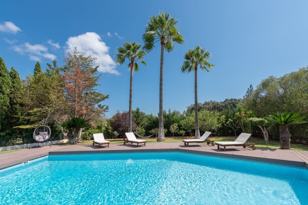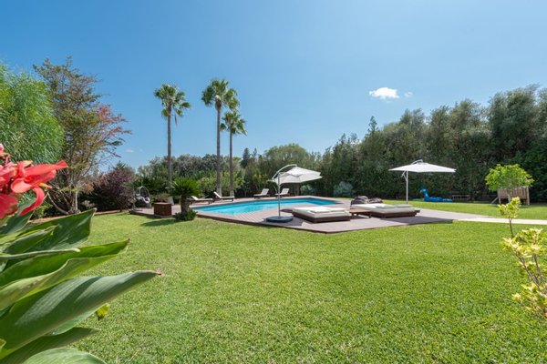 Im Außenbereich umgibt ein großer Garten das Haus und bietet reichlich Platz zum Entspannen und um die mallorquinische Sonne zu geniessen, sowie zur Unterhaltung der Kinder in einem ausgestatteten Spielbereich. Die überdachte Terrasse ist ideal für Mahlzeiten im Freien, während der weitläufige Swimmingpool perfekt für Familienspaß oder ruhige Momente der Entspannung ist.
