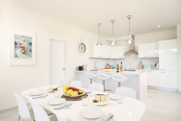 Wenn Sie durch die beeindruckende Doppeltür eintreten, werden Sie von einem offenen Wohn- und Essbereich empfangen, der dank großer Glasschiebetüren in natürliches Licht getaucht ist. Rechts vom Eingang bietet die geräumige Küche Zugang zur überdachten Terrasse und verfügt über einen separaten Waschraum mit Waschmaschine und Trockner. Auf dieser Ebene finden Sie auch eine Gästetoilette und ein großzügiges Schlafzimmer mit eigenem Bad und direktem Zugang zur Terrasse und zum Garten.