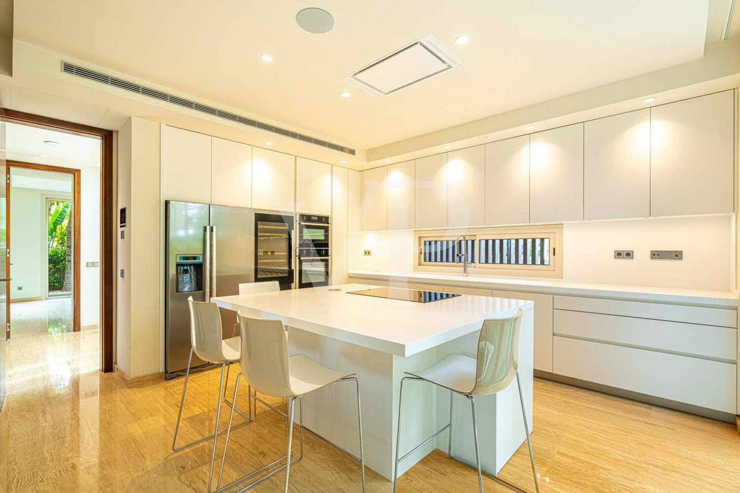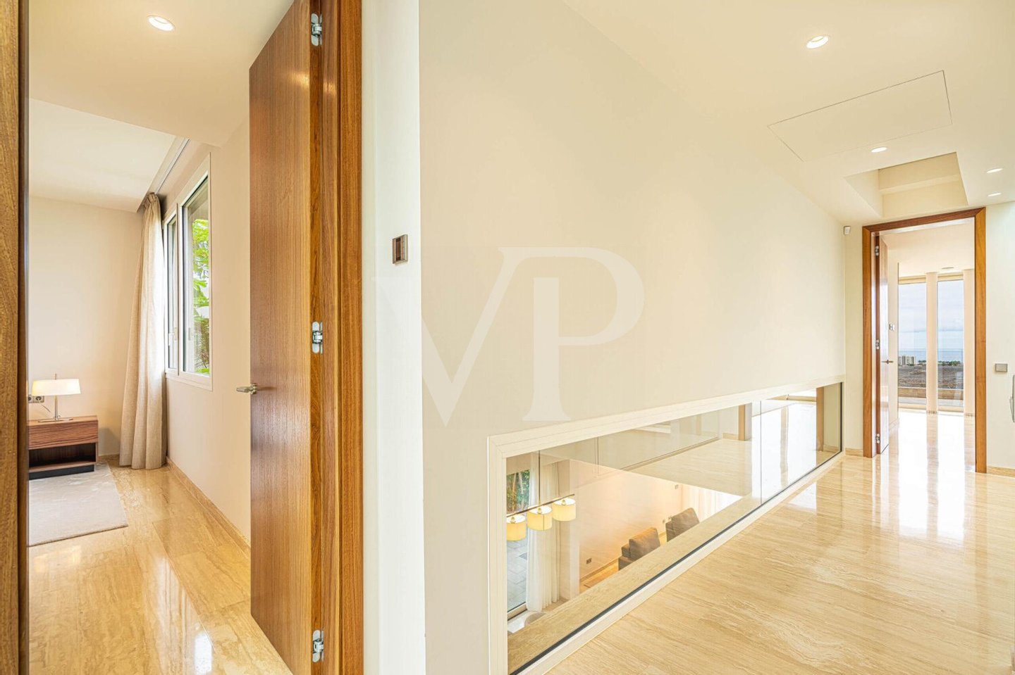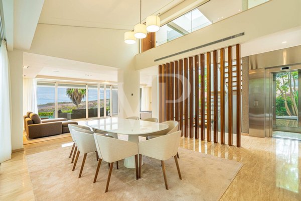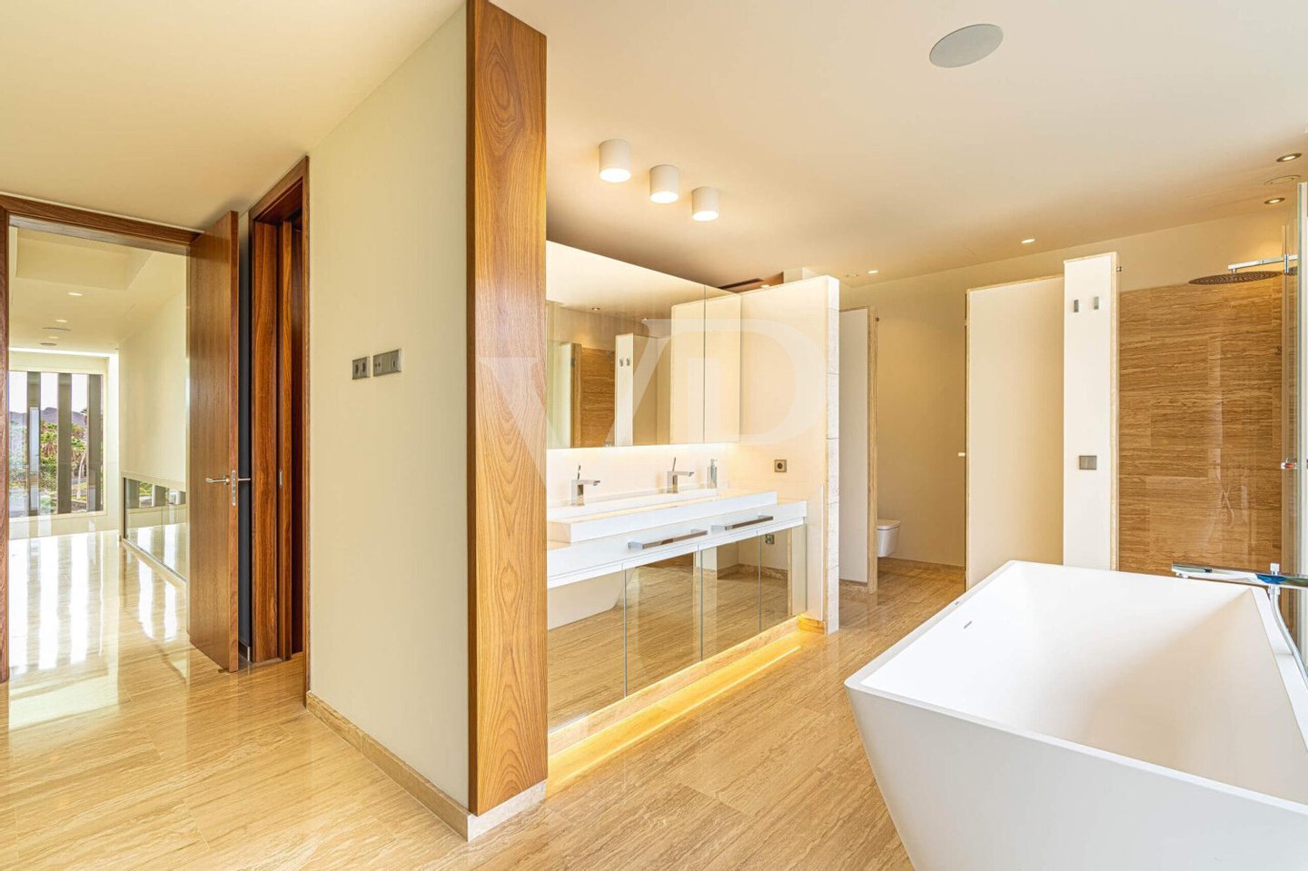 Diese beeindruckende Luxusvilla mit Infinity Pool liegt direkt am Golfplatz Costa Adeje. Dieses Anwesen erstreckt sich über drei Etagen mit insgesamt fünf Schlafzimmer und vereint Luxus, Komfort & Technologie. Das Untergeschoss bietet eine Eingangshalle, ein Gästezimmer mit eigenem Bad, eine Waschküche, einen großen Fitnessraum, ein Duschbad, eine Sauna, einen Abstellraum und eine große Garage für zwei Autos. Das Erdgeschoss ist über eine Treppe und einen Aufzug erreichbar und verfügt über ein helles Gästezimmer sowie eine voll ausgestattete Gourmetküche mit hochwertigen Geräten und einer Mittelinsel. Es bietet Zugang zu einem unglaublichen Esszimmer und Wohnzimmer mit großen Fenstern. Eine überdachte Terrasse führt zum Infinity-Pool. Die obere Etage bietet zwei Gästezimmer mit eigenem Bad. Außerdem gibt es eine majestätische Master-Suite mit Ankleidezimmer, Badezimmer mit Dusche, einer fantastischen Badewanne mit Meerblick und einer großen privaten Terrasse. Diese Immobilie bietet einen exklusiven Lebensstil in atemberaubender Umgebung und Eleganz in bester Lage.