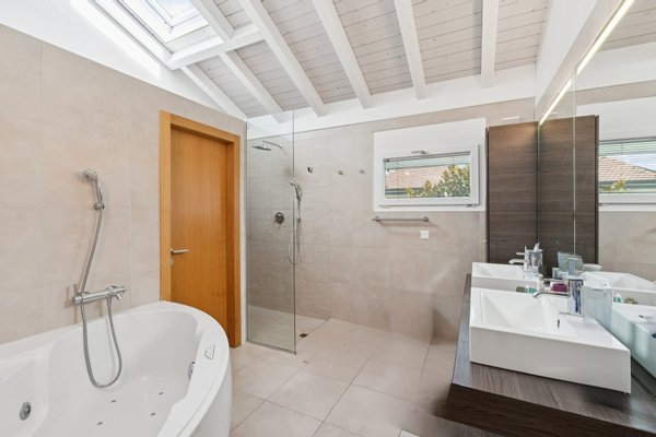 Im Obergeschoss, das über eine schöne Holztreppe erreichbar ist, sorgt ein offener zentraler Raum mit Blick auf das Wohnzimmer für eine luftige Atmosphäre. Die Master-Suite, eine wahre Oase der Ruhe, verfügt über einen geräumigen begehbaren Kleiderschrank, ein Badezimmer mit Badewanne sowie italienischer Dusche und eine private Terrasse von 10 m². Zwei Kinderzimmer mit jeweils eigenem Bad vervollständigen diese Ebene und bieten den Jüngeren Komfort und Unabhängigkeit.