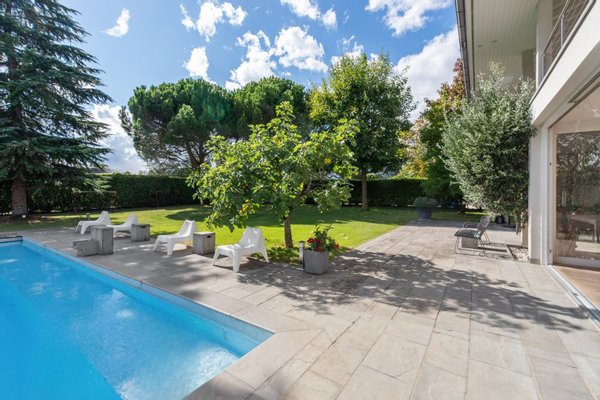 Auf dieser Ebene befindet sich auch ein eigenes Büro, das sich ideal für die Arbeit aus der Ferne eignet, sowie ein Gästezimmer mit eigenem Bad, das den Besuchern Komfort und Unabhängigkeit bietet. Draußen bietet der Garten mehrere Entspannungsbereiche, einen eleganten Pool und alte Bäume, die absolute Privatsphäre gewährleisten.