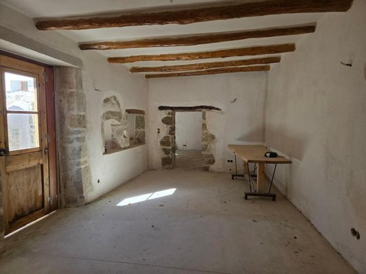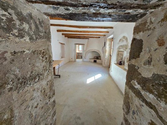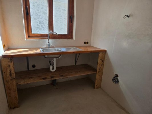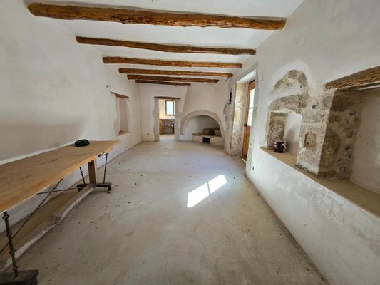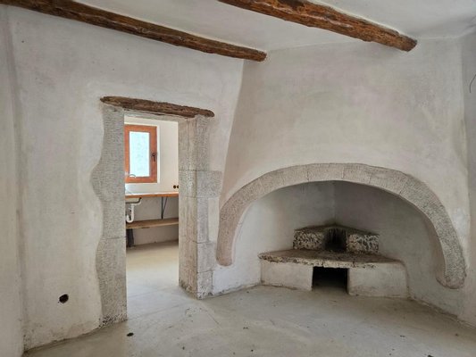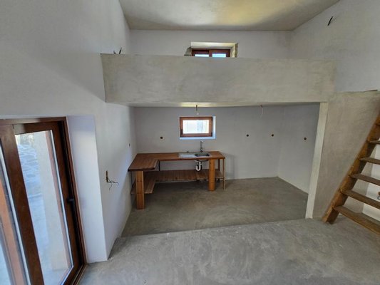Direkt gegenüber befindet sich das zweite Gebäude, das aus einem großen offenen Raum mit einem alten Kamin besteht - einem Raum mit Waschbecken und einem Raum mit Toilette. Von diesem Raum aus gelangen Sie über eine interne Steintreppe mit einem beeindruckenden hölzernen Handlauf in einen großen, von Fenstern umgebenen Raum mit einem außergewöhnlichen Blick auf das Dorf und die Umgebung. . Der Zugang in die erste Etage des Gebäudes ist auch von außen über eine Steintreppe möglich.