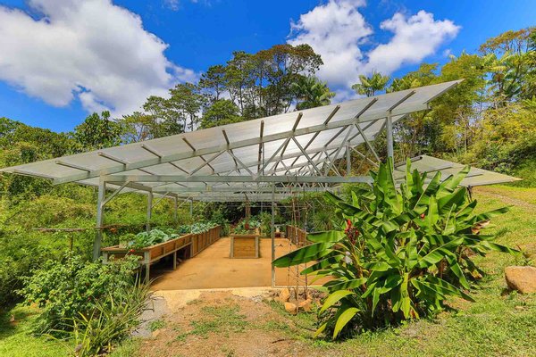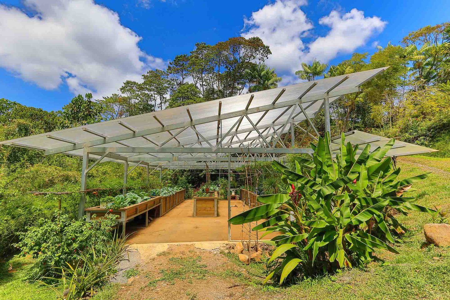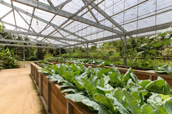 Selbstnachhaltiger Lebensstil: Pflegen Sie einen selbsttragenden Lebensstil mit einem unter Dach befindlichen Produktionsbereich für biologische Lebensmittel mit Hochbeeten, Bewässerung und Beleuchtung.