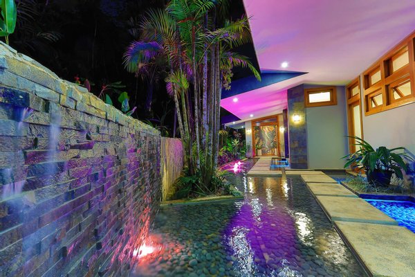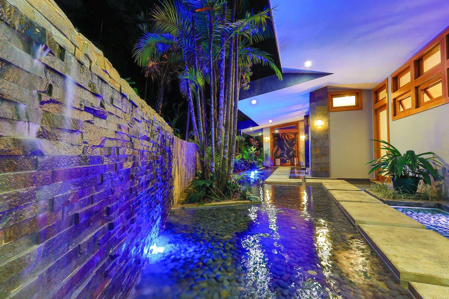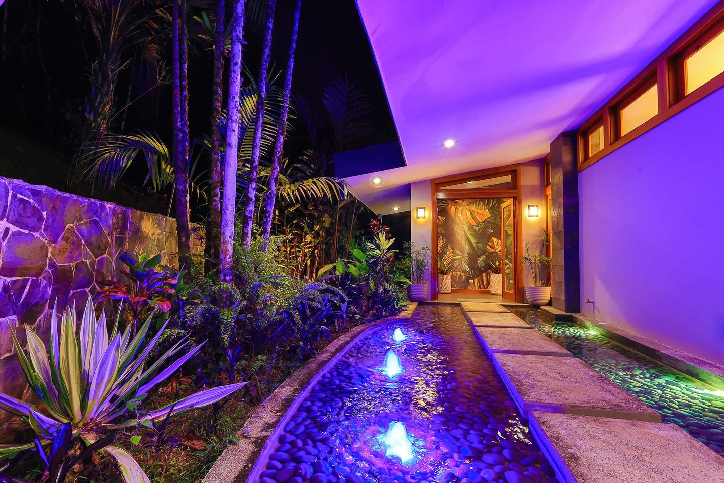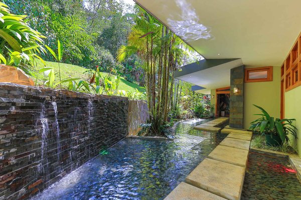 Zauberhaftes Eingangswasserspiel: Wenn Sie am Carport für zwei Autos ankommen, werden Sie von einem spektakulären Wasserspiel begrüßt, das durch Springbrunnen, üppige tropische Landschaften und einen kaskadierenden Wasserfall fließt und einen ruhigen und erfrischenden Ton für Ihren Aufenthalt setzt.