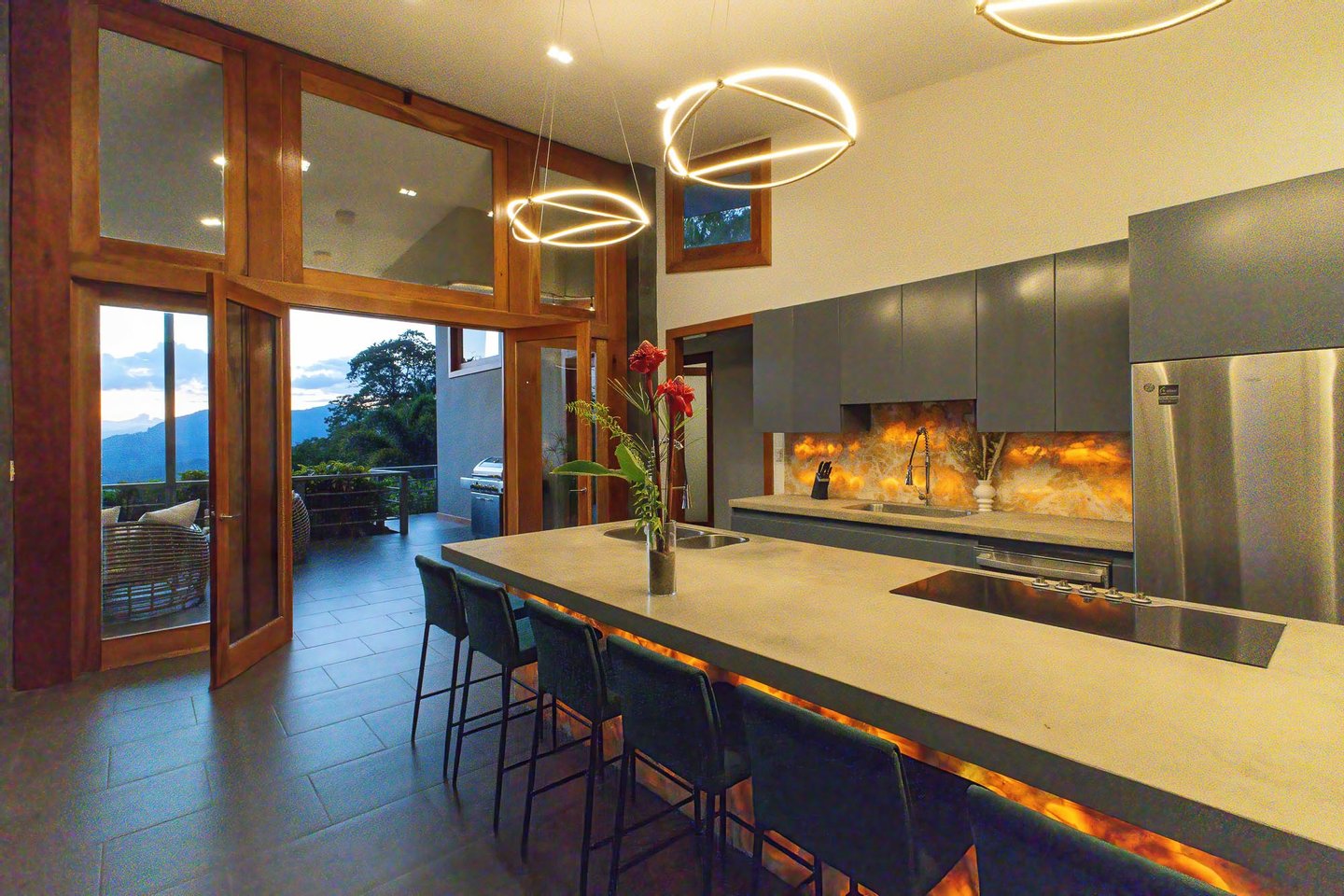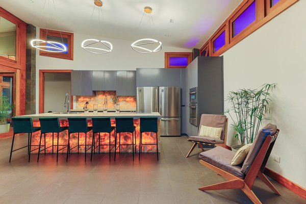 Gourmetküche: Die Gourmetküche verfügt über einen großen Doppelkühl- und Gefrierschrank, hochwertige Geräte und ein atemberaubendes hinterleuchtetes Onyx-Finish auf der Insel und der Rückwand, was sie zu einem Paradies für Köche macht.