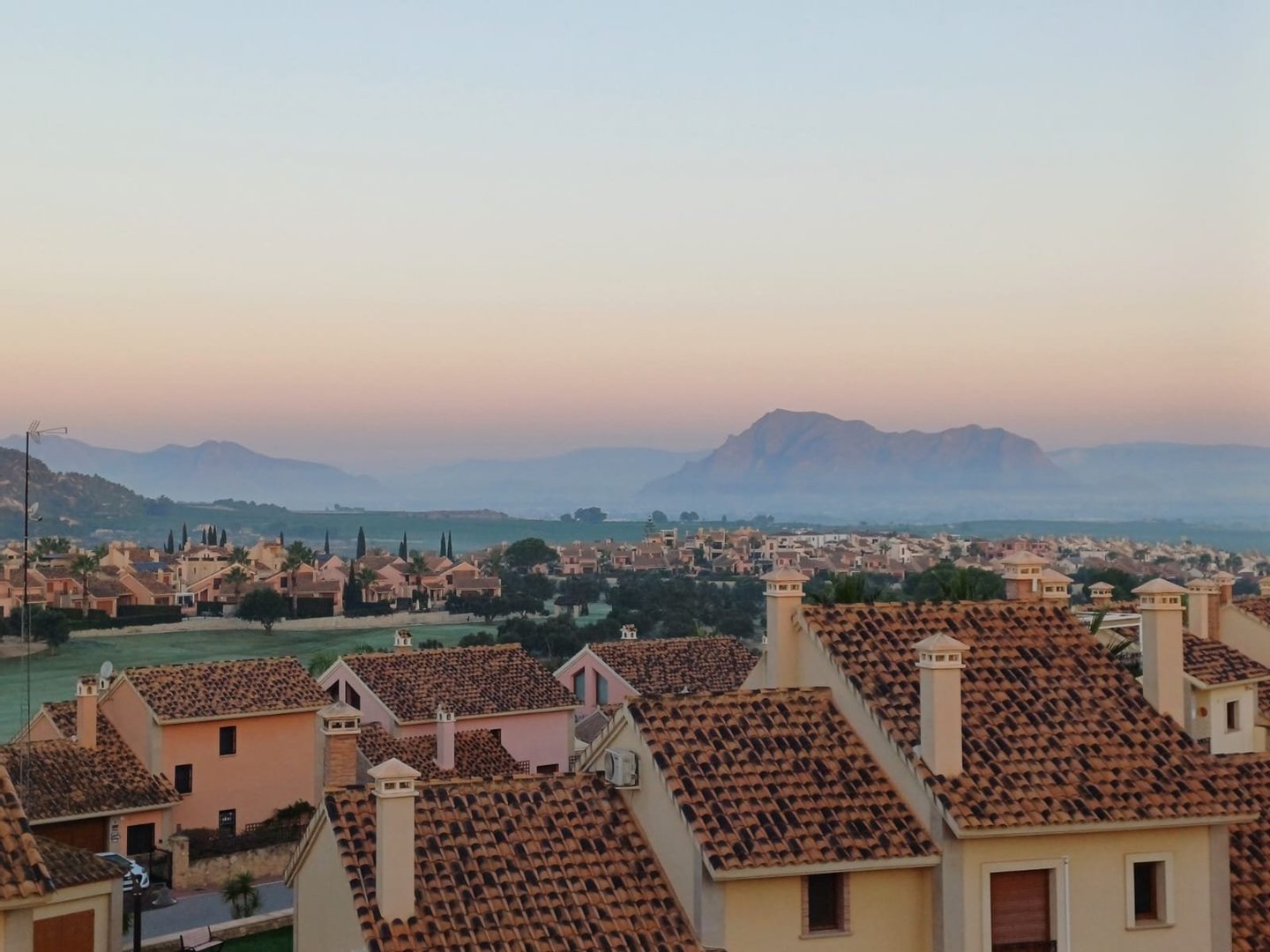 Wenn Sie zurück zur Treppe gehen und in den ersten Stock hinaufsteigen, gelangen Sie zu einer Tür, die Zugang zu einem großen Solarium bietet, das nach Westen ausgerichtet ist und den ganzen Nachmittag über sonnig ist. Von dort aus können Sie den herrlichen Sonnenuntergang hinter den Hügeln in der Ferne beobachten. Zurück im Inneren befindet sich das Hauptschlafzimmer, das größte der Schlafzimmer, mit einem begehbaren Kleiderschrank und einem eigenen Duschbad. Durch Glasschiebetüren gelangt man separat auf die Sonnenterrasse. Wenn Sie dann die Treppe hinuntergehen und die Villa verlassen, gelangen Sie in einen umlaufenden Garten, der zwar ein wenig Pflege benötigt, aber groß genug ist, um einen eigenen Pool anzulegen, wenn Sie möchten. Da er jedoch nur einen kurzen Spaziergang vom großzügigen Gemeinschaftspool entfernt ist, haben Sie die Wahl!