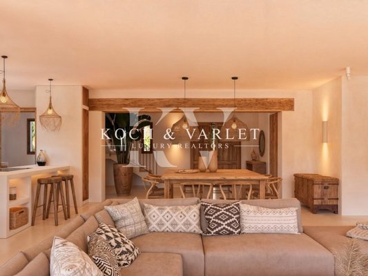 Conçue dans un style traditionnel qui combine des éléments rustiques et méditerranéens, cette propriété de 371 m² construits offre 4 chambres en suite, des toilettes invités et de grands espaces intérieurs et extérieurs. Le projet se caractérise par son souci du détail et la qualité de ses matériaux : sols en pierre naturelle CAPRI, finitions en béton ciré, plafonds en tuiles arabes anciennes et revêtements intérieurs de style Ibiza.