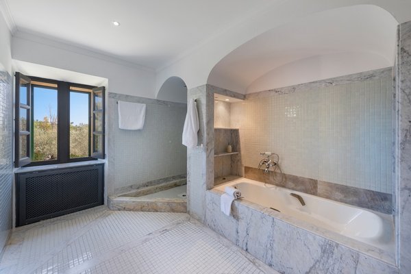 Das Haupthaus verfügt über insgesamt fünf Schlafzimmer und vier Bäder. Im Erdgeschoss befinden sich eine Küche, ein Essbereich, ein Wohnzimmer mit Kamin und eine originale Olivenmühle, die in das Design integriert wurde. Von hier aus gelangt man auch direkt auf die Terrasse und in den Garten.