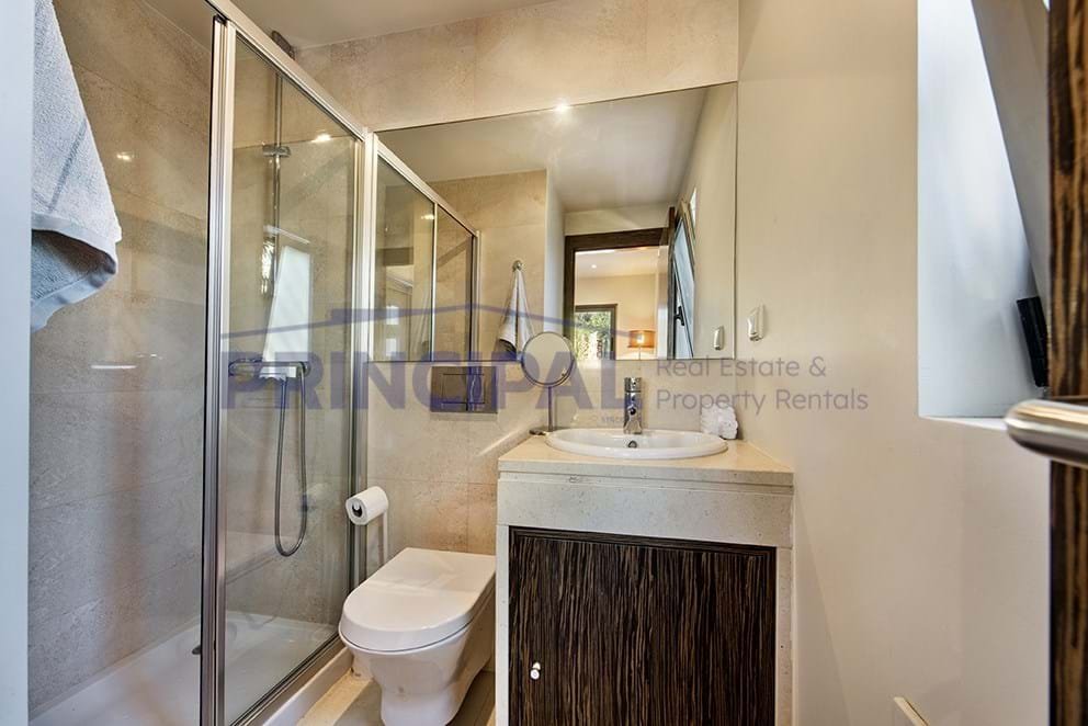 Erdgeschoss - Eingangshalle; Wohn- und Esszimmer mit Kamin und Klimaanlage, voll ausgestattete Küche in halboffenem Grundriss, beide mit Zugang zur Südterrasse; Master-Suite mit Badewanne und Duschwanne mit Zugang zur Südterrasse, eine Gästesuite mit Dusche. Alle Suiten verfügen über Einbauschränke.