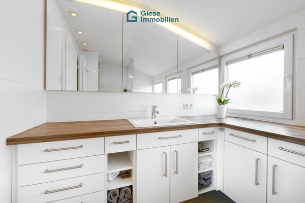 Das Badezimmer ist ein echtes Schmuckstück: modern, stilvoll und mit Liebe zum Detail ausgestattet. Die großzügige begehbare Dusche mit eleganter Glasverkleidung, der edle Waschtisch und die vielen Stauraumlösungen zeigen, dass hier nicht einfach renoviert, sondern mit Weitblick und Sinn für Komfort gestaltet wurde.