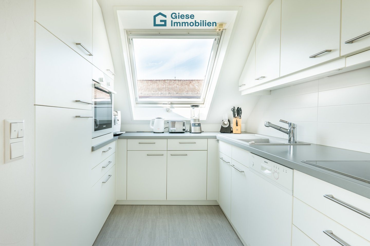 Besonders hervorzuheben ist die maßgefertigte Einbauküche eines Degerlocher Schreiners, ausgestattet mit hochwertigen Bosch-Elektrogeräten – ein Stück Handwerkskunst, das Kochen zu einem Genuss macht.
