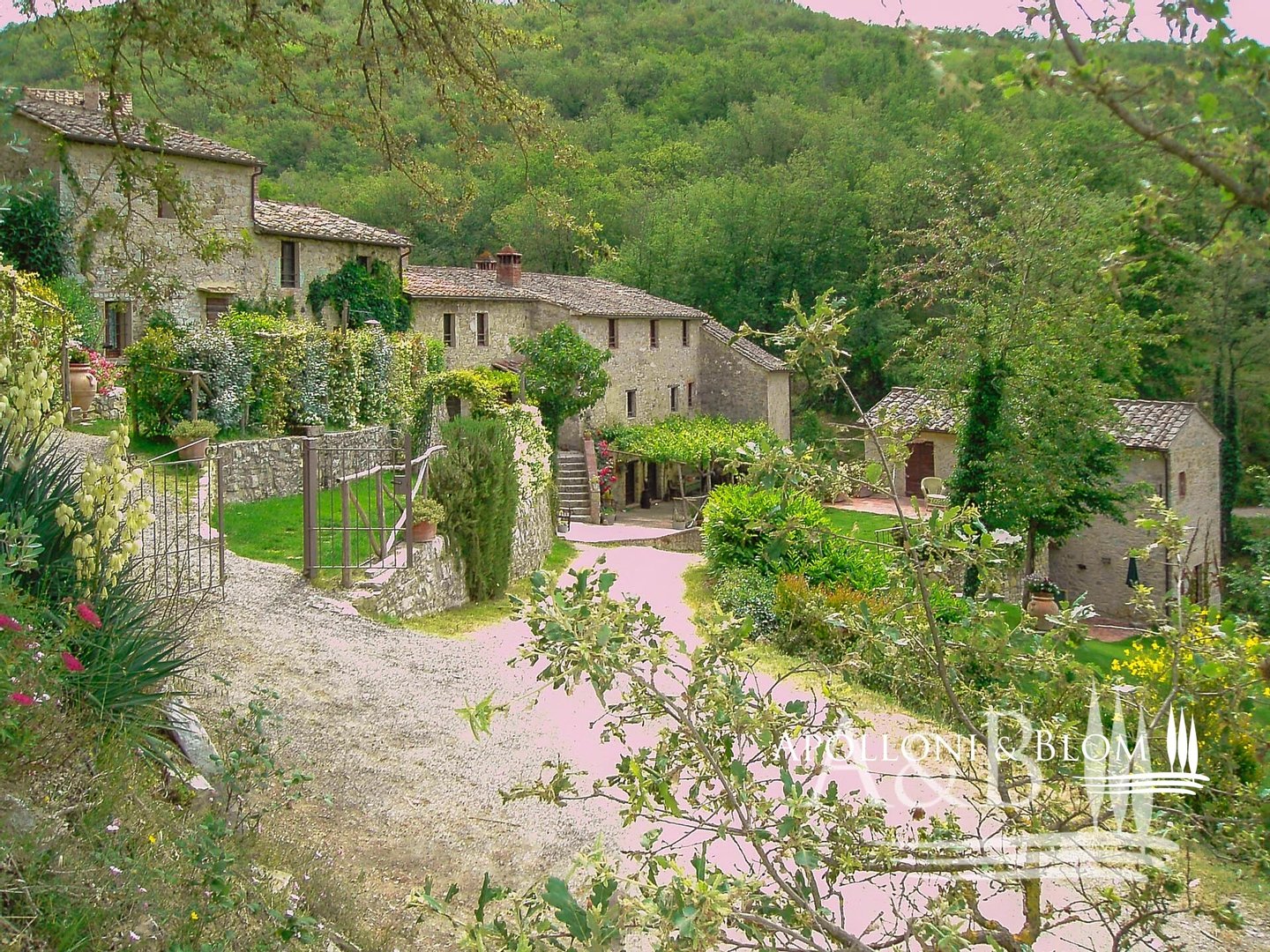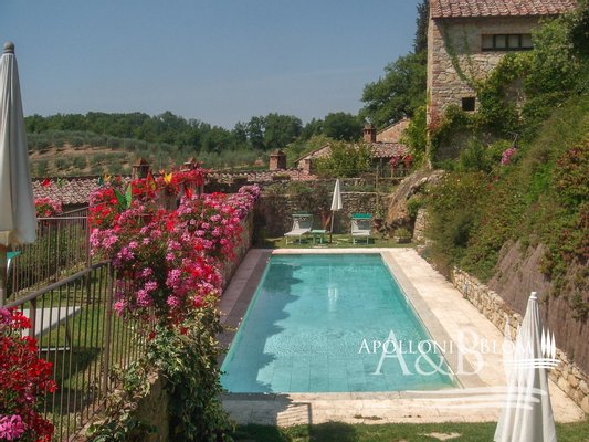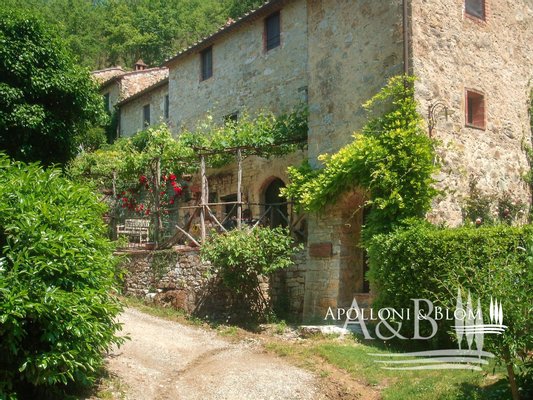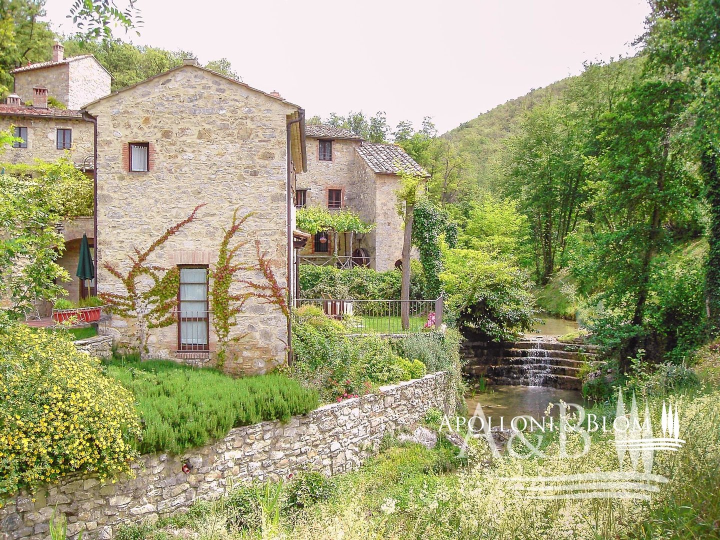 Bauernhaus mit Bauernhaus und alter Mühle, Land und Pool zu verkaufen in Castellina in Chianti, Siena. In den wunderschönen Hügeln des Chianti, nur wenige Kilometer von Castellina in Chianti entfernt, in einem der begehrtesten Orte der Toskana, umgeben von jahrhundertealten Wäldern und Reihen von Sangiovese-Reben, ein verwunschener Ort, wo das Rauschen des Wassers des Baches eine Harmonie des Friedens und der Ruhe klingt. Das Haus wurde fachmännisch restauriert, nachdem es im frühen Mittelalter als Mühle genutzt wurde, um die Ernte der Chianti-Bauern zu mahlen. Die Restaurierung ermöglichte es, aus dem Hauptgebäude vier Wohnungen und zwei unabhängige Häuser, die einst die Mühlen des Ortes waren, zu schaffen, so dass insgesamt 13 Zimmer und elf Bäder zur Verfügung stehen. In jedem Zimmer sind die ursprünglichen Merkmale erhalten geblieben, vom freigelegten Mauerwerk bis zu den Holzbalken und den traditionellen Terrakottaböden. Um die Überreste der alten Mühle herum wurden ein Schwimmbad und verschiedene Terrassen für das Leben im Freien angelegt. Jedes Jahr wählen Gäste und Besucher diesen Ort für ihren erholsamen Urlaub. Zum Anwesen gehören etwa 10 Hektar Land, hauptsächlich Wald, sowie ein kleiner Weinberg und ein Olivenhain.