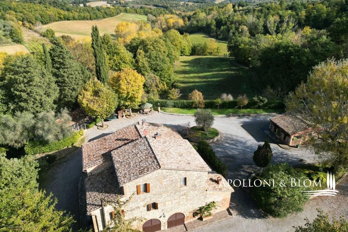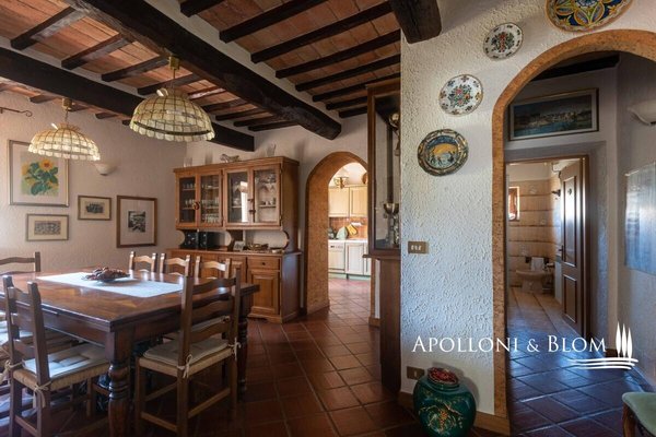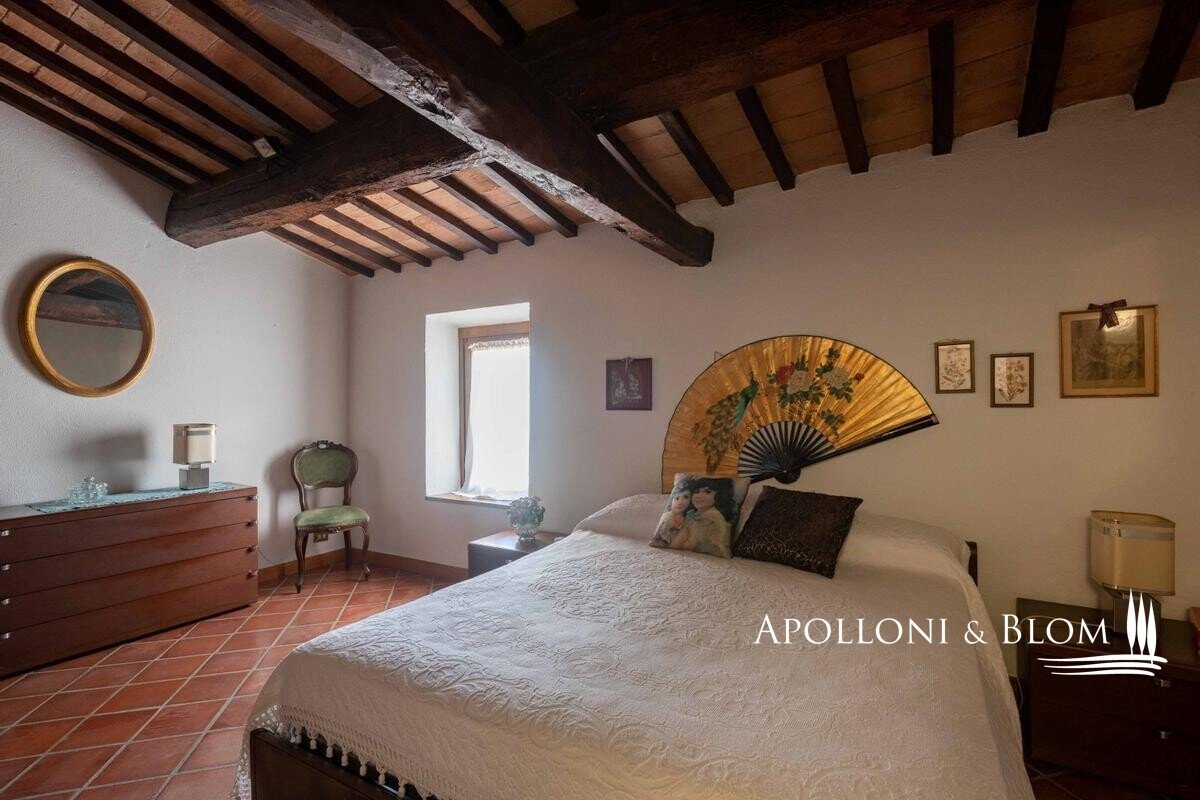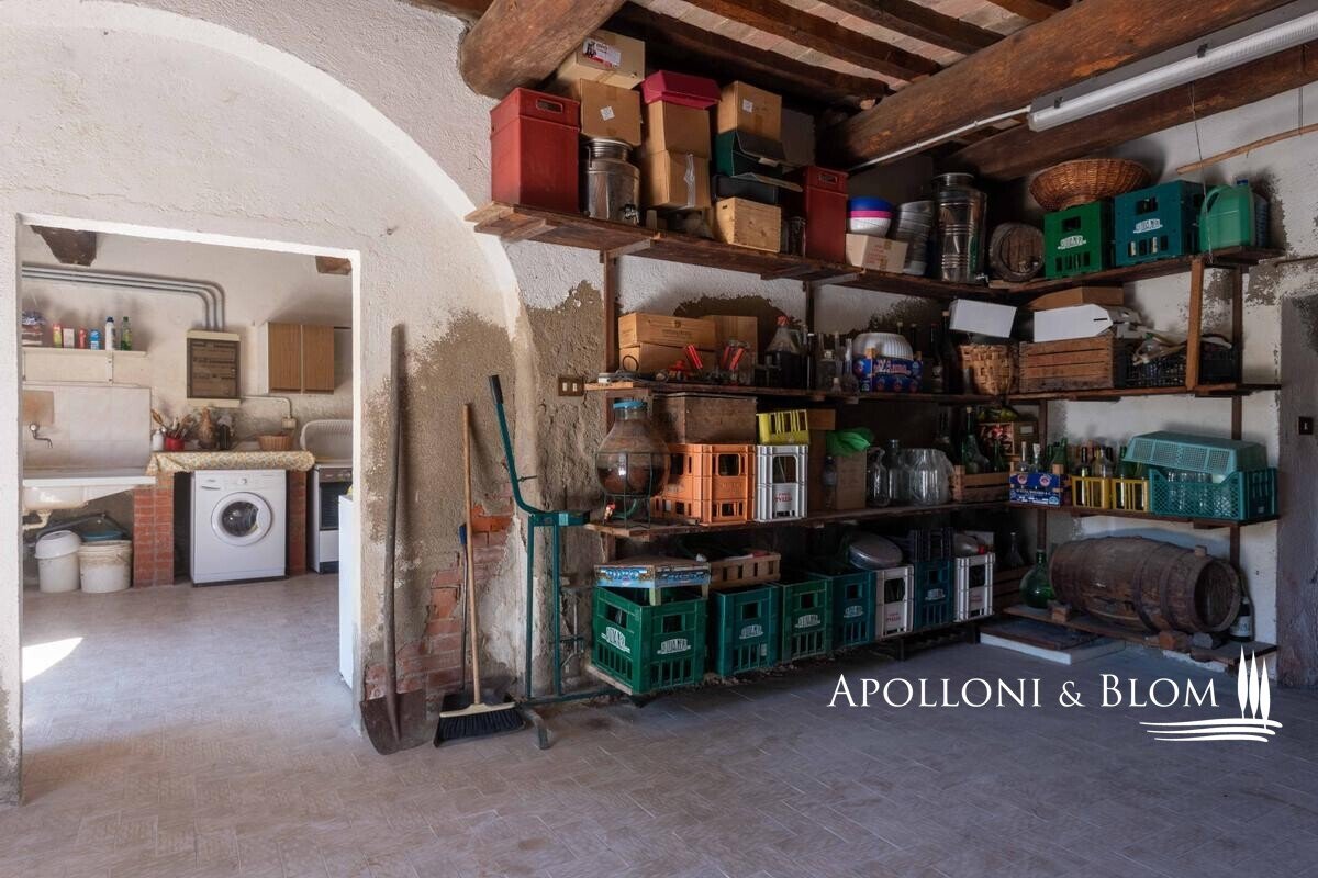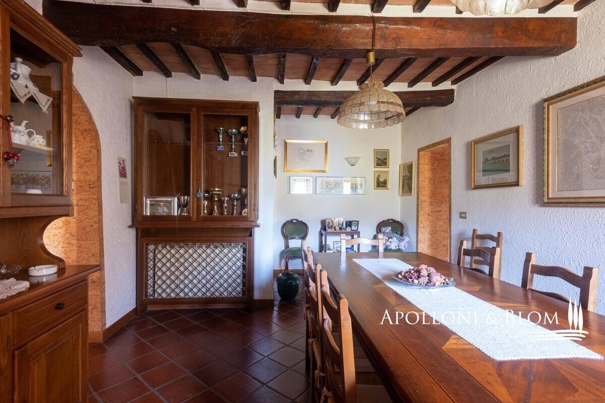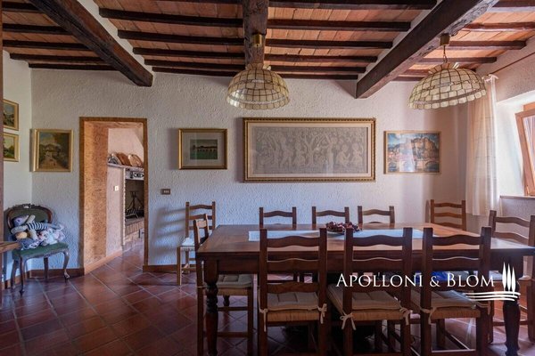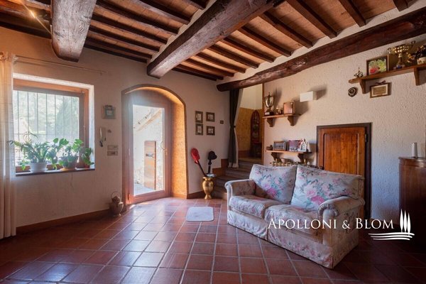6,5 Hektar großes Anwesen mit altem Bauernhaus, Olivenhain und umzubauenden Nebengebäuden in Cetona zu verkaufen. Nur wenige Schritte vom historischen Zentrum von Cetona entfernt, in einer privilegierten Panoramalage mit freiem Blick auf die toskanische Landschaft, liegt dieses charmante Bauernhaus aus dem 19. Jahrhundert. Die Residenz, die sich durch ihre klassische Steinfassade und ihren zeitlosen rustikalen Charme auszeichnet, erstreckt sich über drei Ebenen mit einer Fläche von ca. 294 m². Im Erdgeschoss befinden sich die Wohnräume, während der Schlafbereich im ersten Stock ein Hauptschlafzimmer mit eigenem Bad, vier weitere Schlafzimmer und ein Familienbad umfasst. Terrakottaböden, Balkendecken, Holzfensterrahmen und Fensterläden bewahren die toskanische Authentizität. Ein mediterraner Garten mit Freiflächen lädt zum Entspannen und Essen ein und beherbergt drei Nebengebäude von 20 qm, 30 qm und 70 qm, die derzeit als Holzschuppen, Lager und Werkzeugschuppen genutzt werden und großes Potenzial für den Umbau in zusätzliche Wohn-, Arbeits- und Wellnessbereiche bieten. Um das Bauernhaus herum befinden sich ca. 6,5 Hektar Land, darunter ein Olivenhain mit 170 Bäumen, Wald und Ackerland sowie ein interessanter Weinberg von ca. 1 Hektar, der heute nicht bewirtschaftet wird, aber hervorragende Möglichkeiten für die Neubepflanzung mit Qualitätsreben bietet, die das Anwesen wieder an seine edle Weinbautradition heranführen könnten. Mitten in der Natur, aber in der Nähe des Dorfes und aller Dienstleistungen, ein prestigeträchtiger Wohnsitz, der die authentischste Essenz des toskanischen Lebens verkörpert.