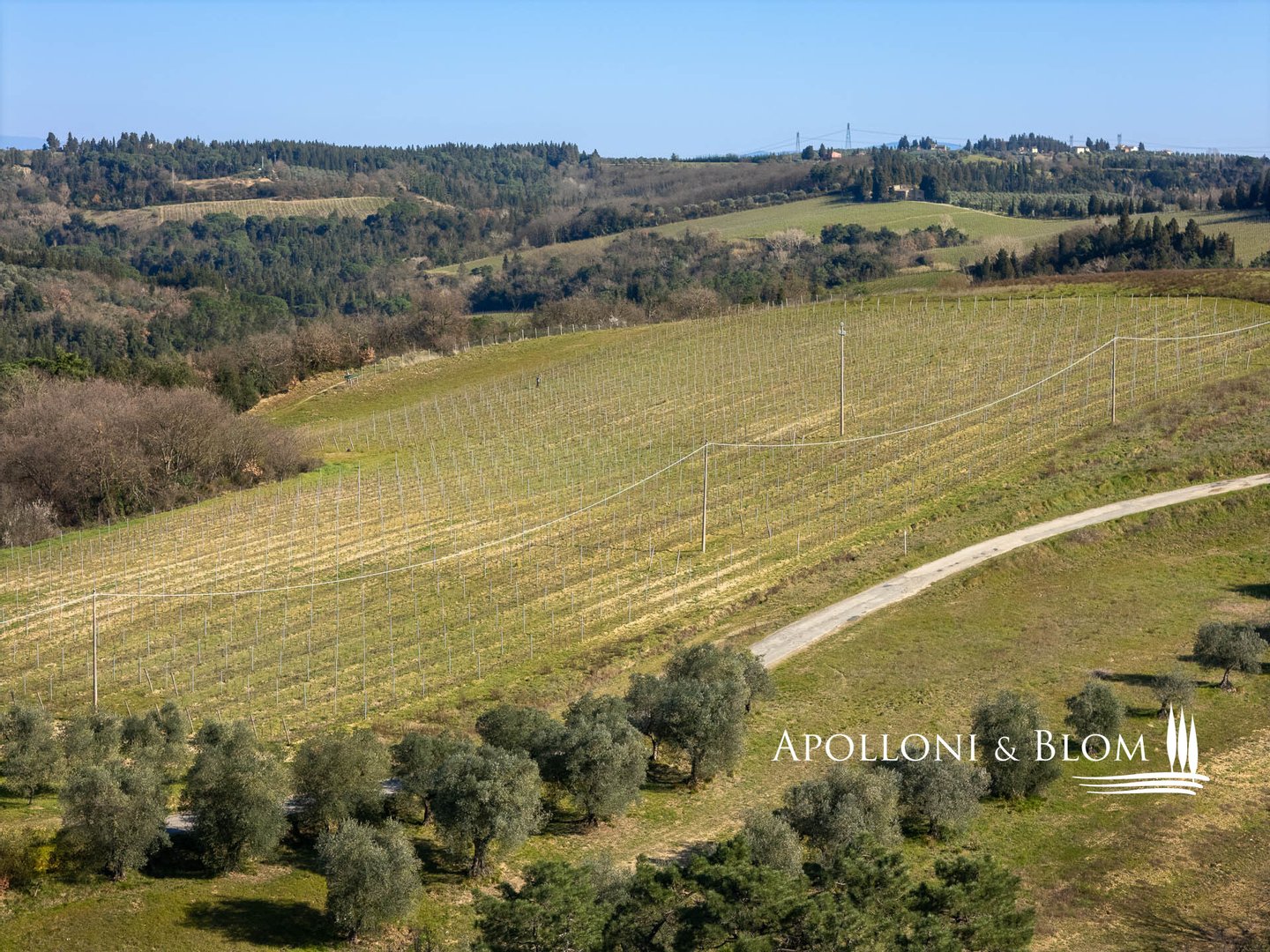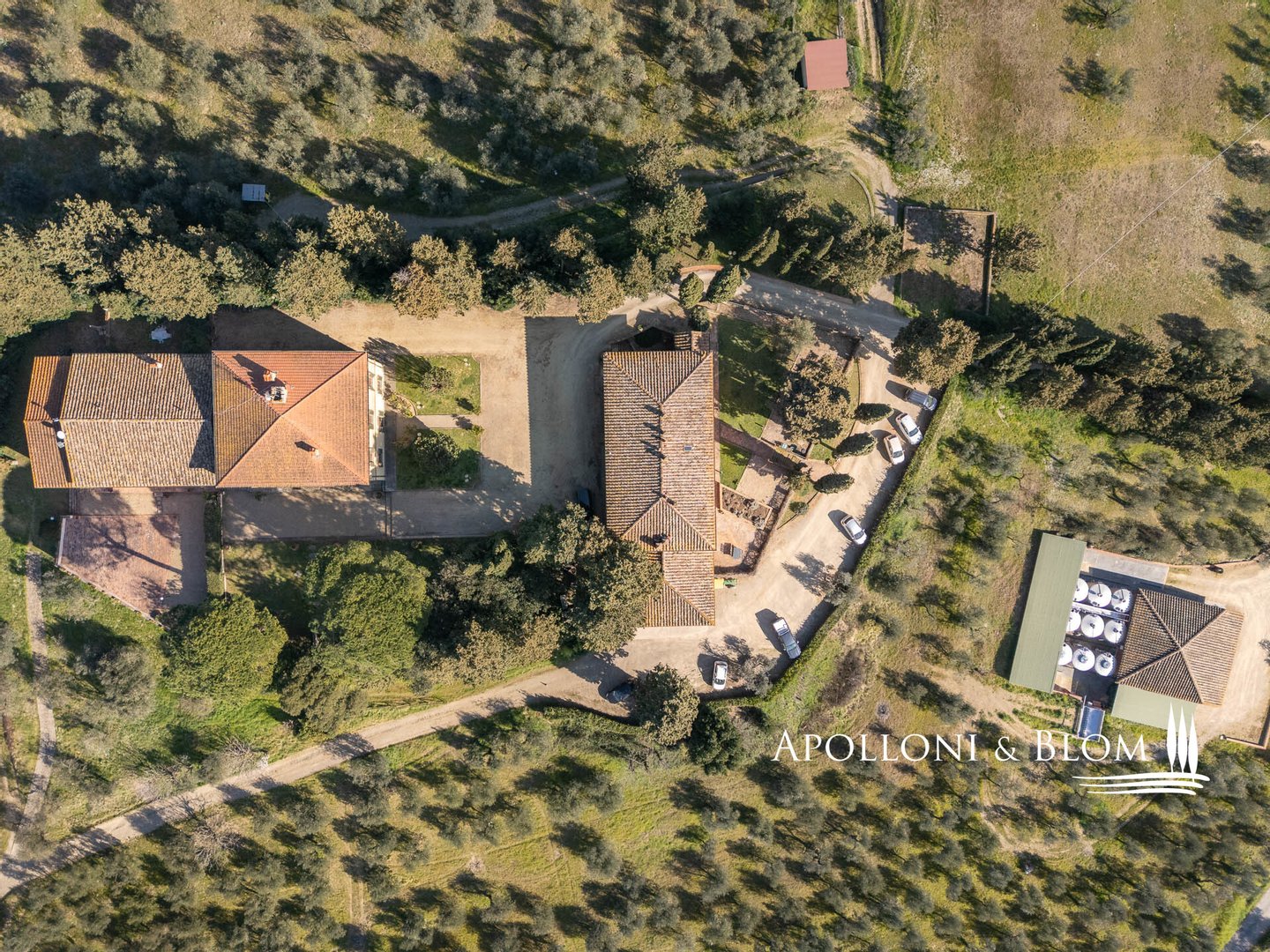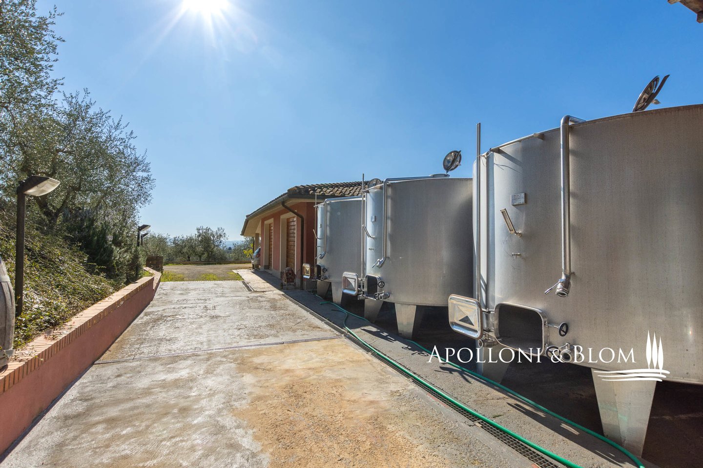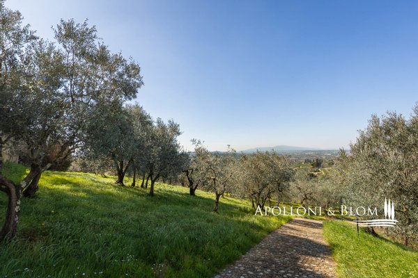 Land: insgesamt 124 Hektar mit Garten, privater Zufahrt, Parkplätzen und Manövrierflächen, landwirtschaftlich genutzte Flächen, darunter 28 ha Weinberge, 26 ha Olivenhaine