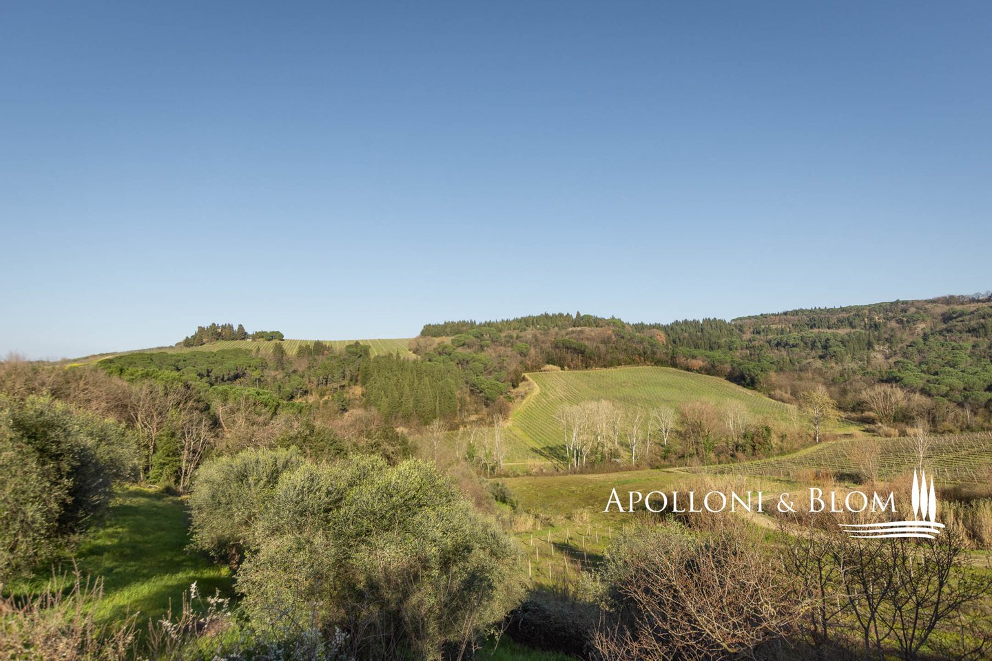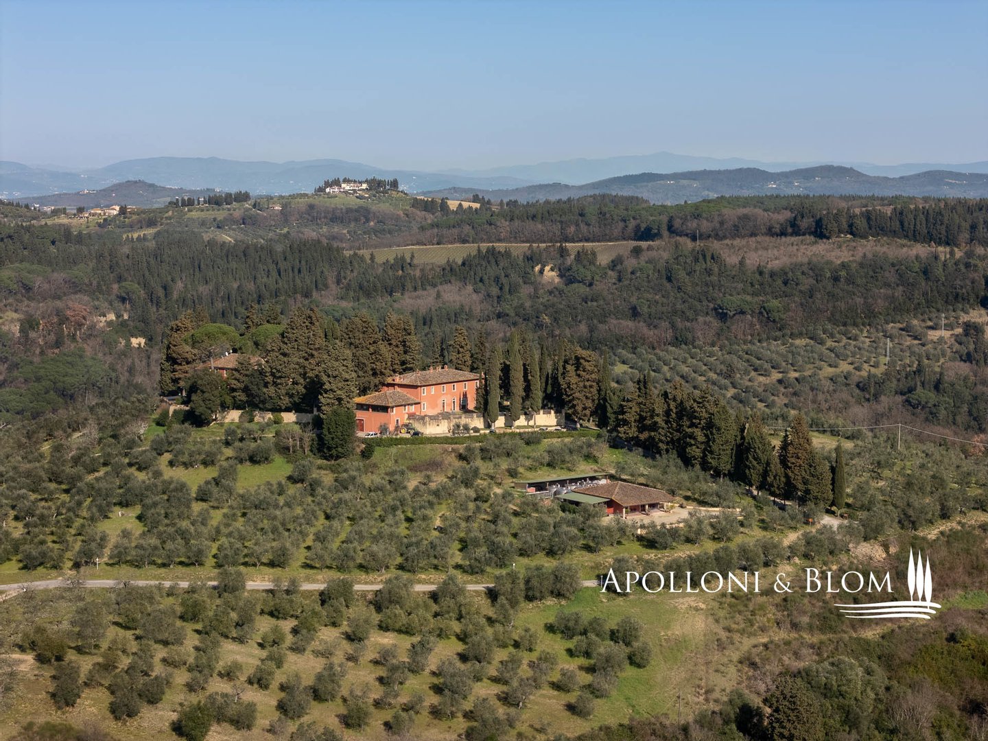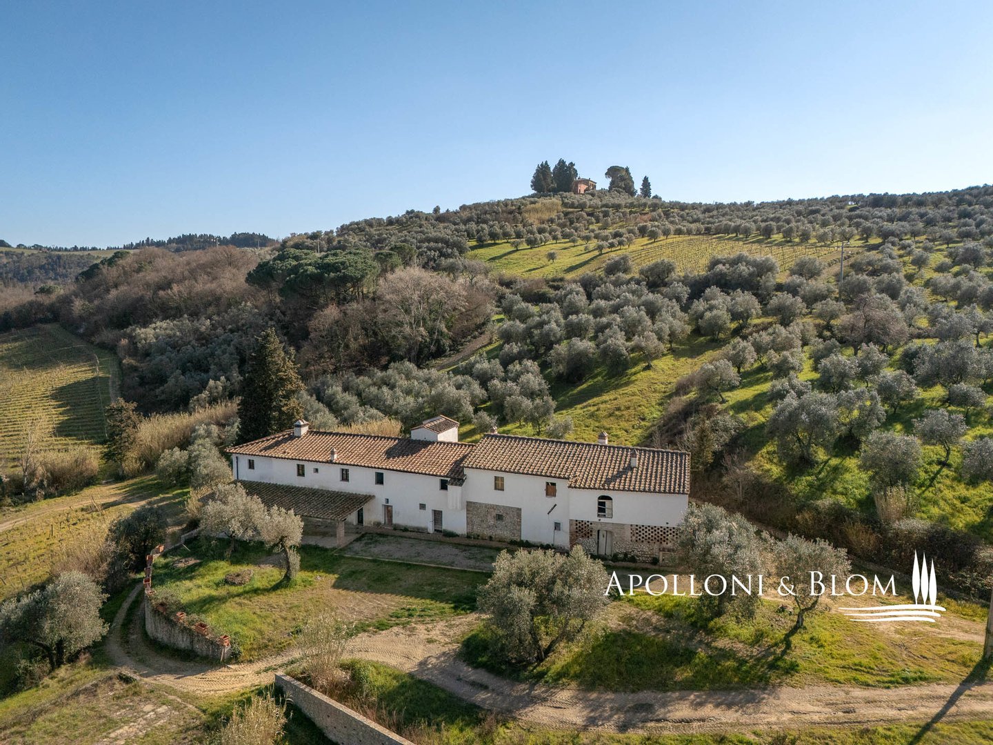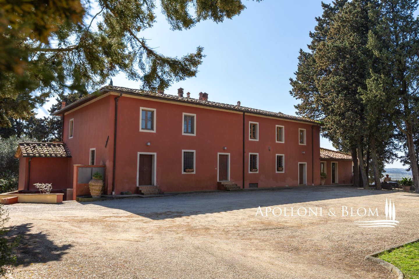 Land: insgesamt 124 Hektar mit Garten, privater Zufahrt, Parkplätzen und Manövrierflächen, landwirtschaftlich genutzte Flächen, darunter 28 ha Weinberge, 26 ha Olivenhaine