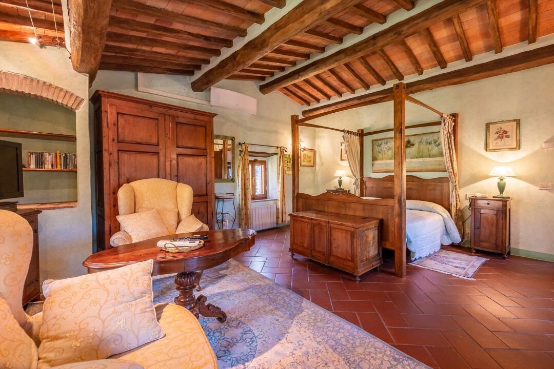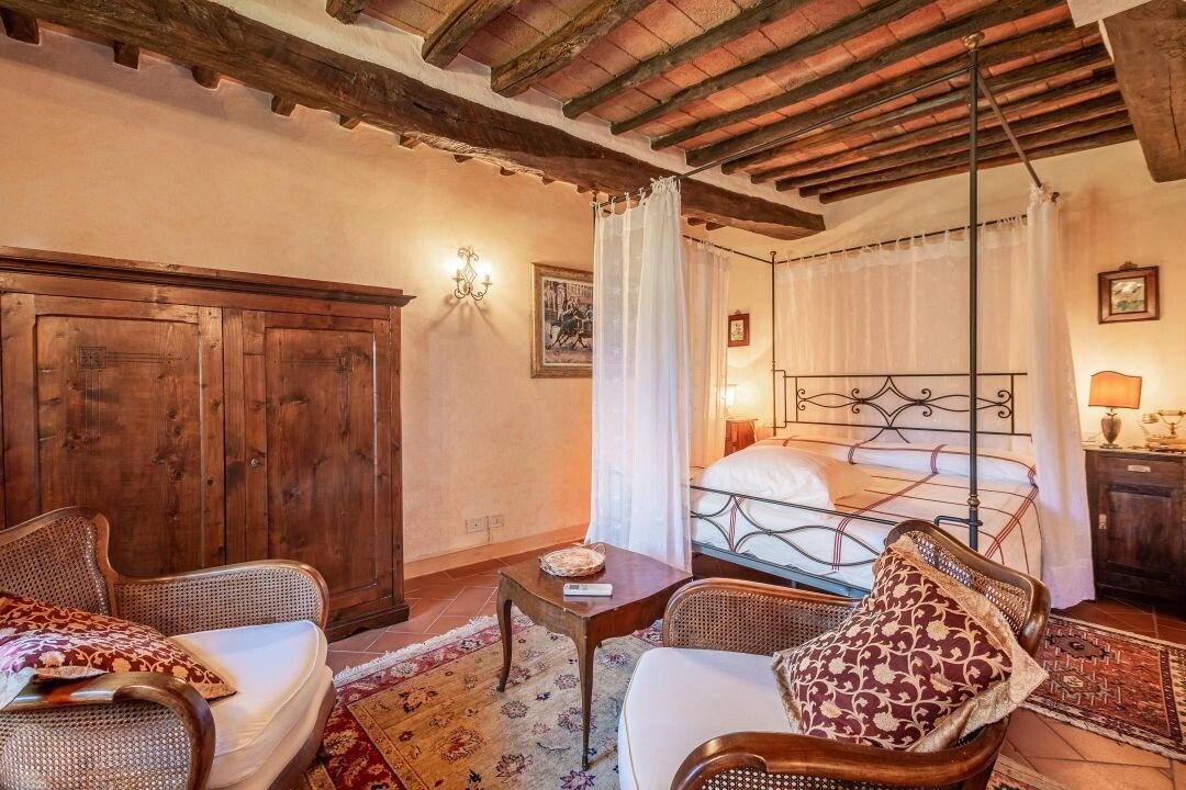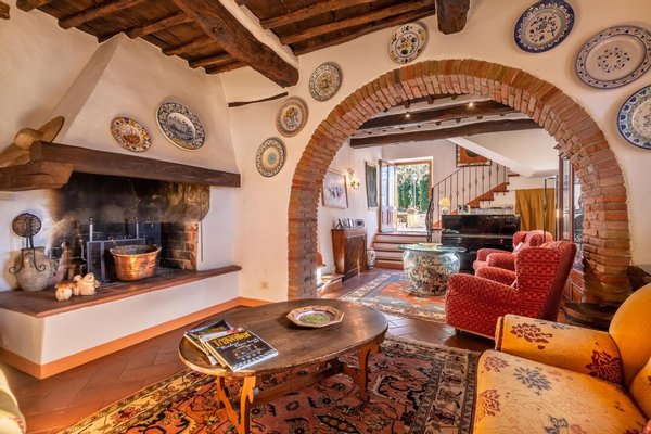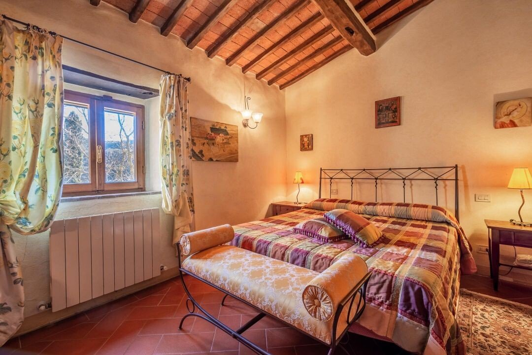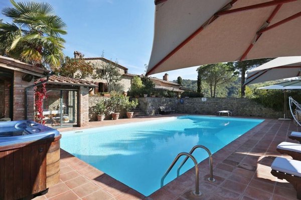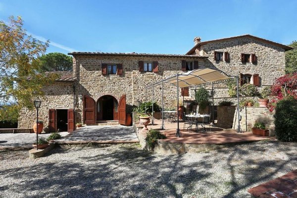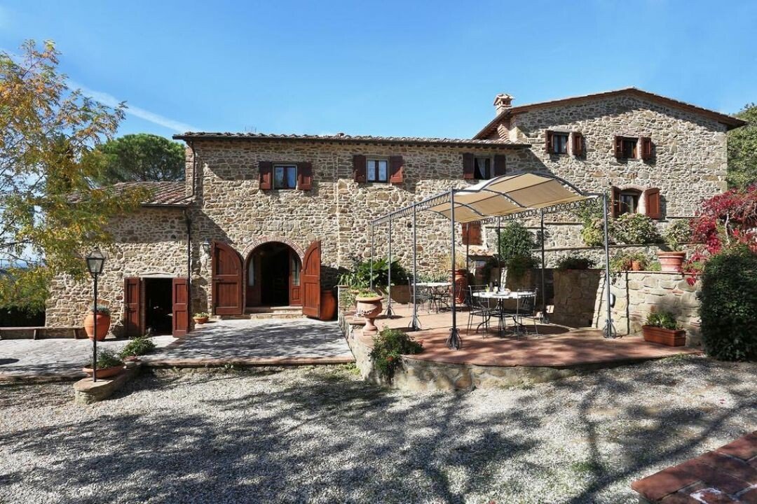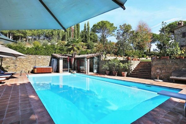 Bezaubernde Landvilla aus dem 15. Jahrhundert mit Pool, Olivenhain und Weinberg zu verkaufen, nur 5 km von Gaiole in Chianti, Siena entfernt. Im Herzen des Chianti Classico, umgeben von jahrhundertealten Wäldern und Reihen von Weinstöcken, in der Nähe von prestigeträchtigen Ländereien mit Schlössern und mittelalterlichen Dörfern, führt ein weißer Kiesweg zu einer mit Steinen und Zypressen geschmückten Auffahrt, die zu einer wunderschönen Umgebung mit zentraler Villa führt, umgeben von Garten, Olivenhain, Weinberg und Wald mit spektakulärem Blick auf die Landschaft. Die Villa ist das Ergebnis der geschickten Restaurierung eines traditionellen Chianti-Bauernhauses aus dem Jahr 1400 mit freiliegenden Steinfassaden und -wänden, Fenstern mit Holzläden und Giebeldächern, die mit traditionellen toskanischen Ziegeln gedeckt sind. Die Innenräume bieten immer noch die rustikale, geschichtsträchtige Atmosphäre mit Terrakottabögen und Holzdecken, die mit Marmorbädern mit Whirlpool, Kaminen, Majolikafliesen und Wandgemälden verbunden sind und dem ganzen Haus eine elegante und raffinierte Atmosphäre verleihen. Der Außenbereich der Villa besteht aus Terrassen mit Pavillons und Wohnbereichen im Freien sowie einem Pool mit Jacuzzi. In den Innenräumen befinden sich Wohnzimmer mit Kaminen, ein Klavier, ein Esszimmer im Wintergarten, eine Küche und ein Zugang zur Außenküche mit Ofen und Grill. Das Hauptschlafzimmer im Erdgeschoss hat einen eigenen Eingang und verfügt über ein Himmelbett, ein Badezimmer mit Dusche und Jacuzzi. Im zweiten Stock, der sowohl über eine Innen- als auch eine Außentreppe erreichbar ist, befinden sich ein Wohnzimmer mit Kamin, vier Schlafzimmer mit eigenem Bad, zwei davon mit Whirlpool. Alle Räume werden durch eine Klimaanlage gekühlt. Die Solaranlage sorgt im Sommer für Warmwasser und im Winter für eine Teilheizung. Eine Alarmanlage und ein eingezäunter Garten mit automatischem Tor sorgen für Privatsphäre und Sicherheit. Zu den über 6 Hektar Privatgrund gehören ein kleiner Weinberg mit der Produktion von Chianti Classico Wein, ein Olivenhain mit 100 Bäumen, Wald und Ackerland. Perfekt als Ferienvilla, bereit zu leben, für den privaten Gebrauch oder Einkommen Eigentum Hosting Reisende für ihre Ferien in Chianti.