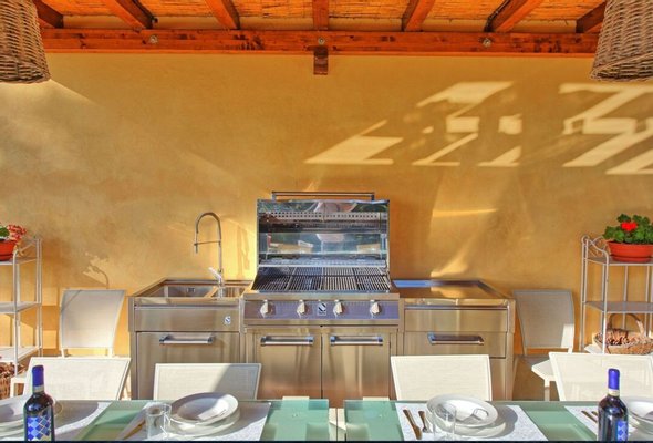 Land/Garten: Olivenhain von ca. 1,5 Hektar mit ca. 50 Olivenbäumen. Umzäunter Garten mit Bewässerungsanlage, mit Terrasse, Außenküche und Grill