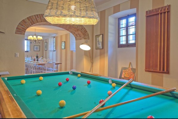 Erdgeschoss: Großes Wohnzimmer mit Esszimmer und Zugang zum Garten, Esszimmer mit schönem Kamin, große Küche, Wohnzimmer mit Billardtisch, Doppelschlafzimmer mit Klimaanlage, Wohnzimmer mit Kamin, Bad mit Dusche