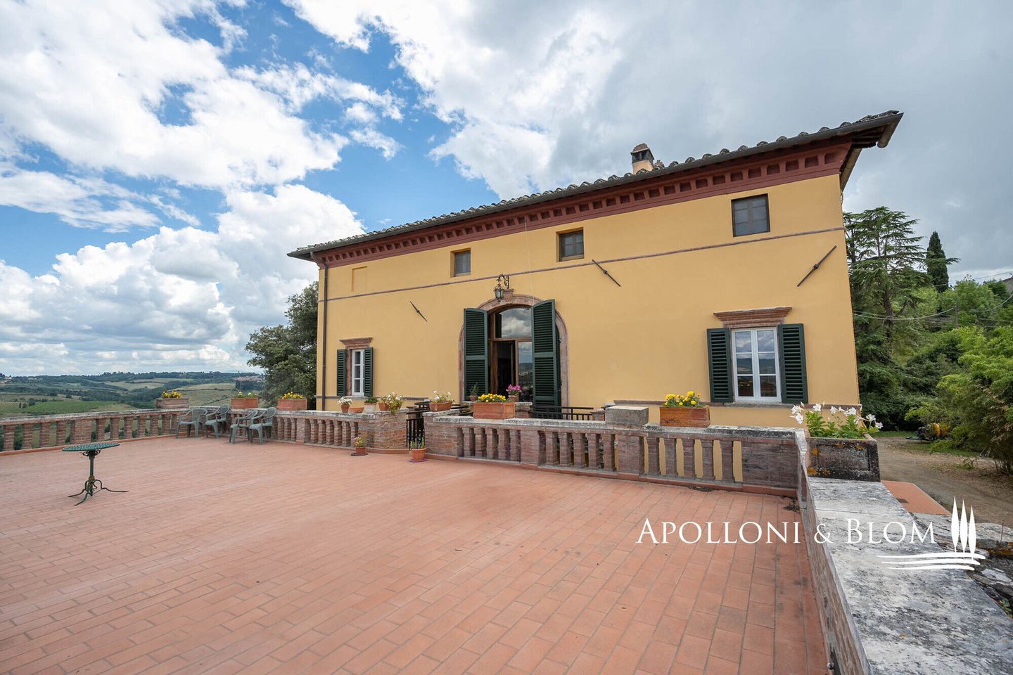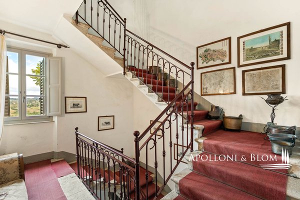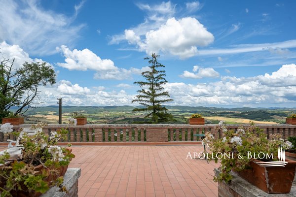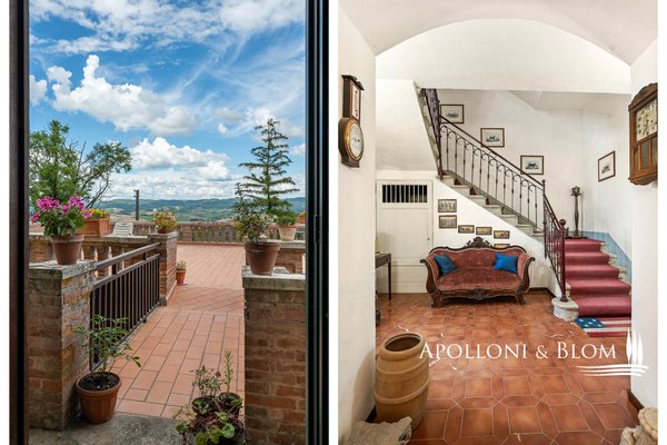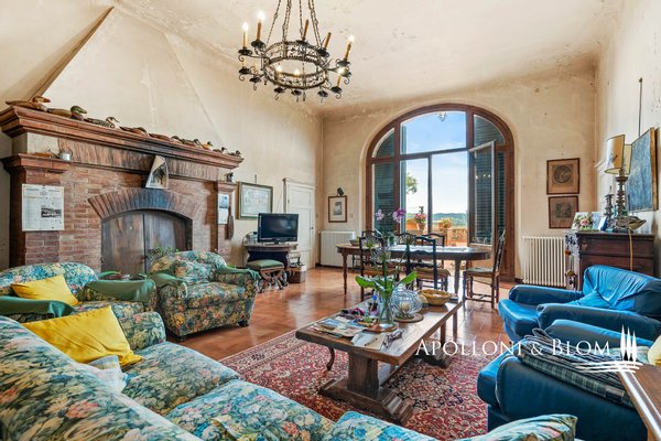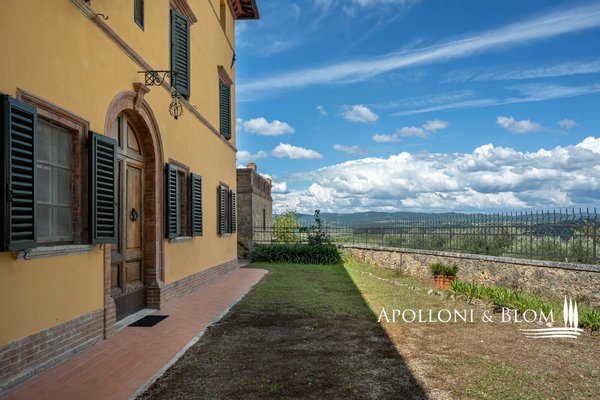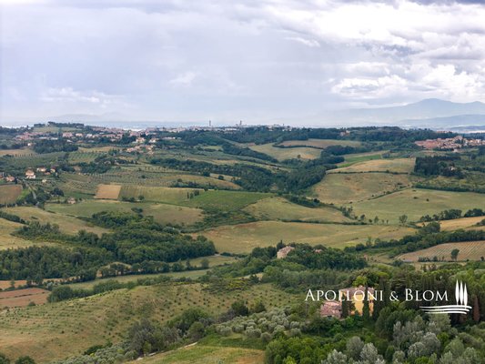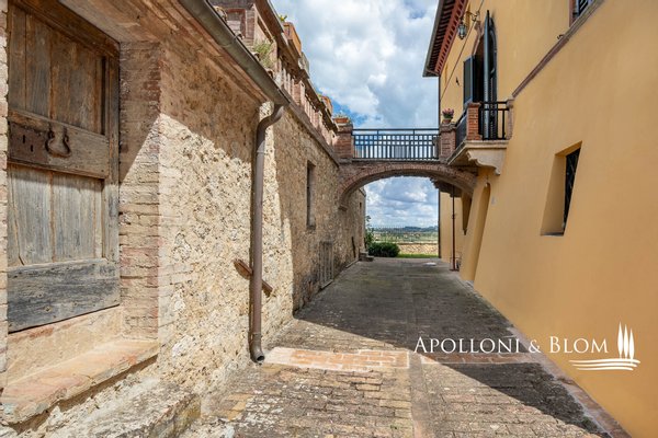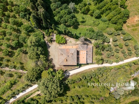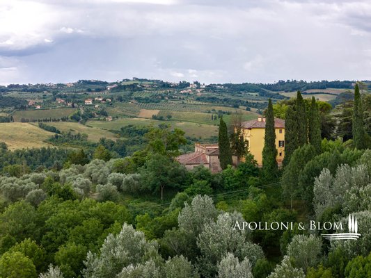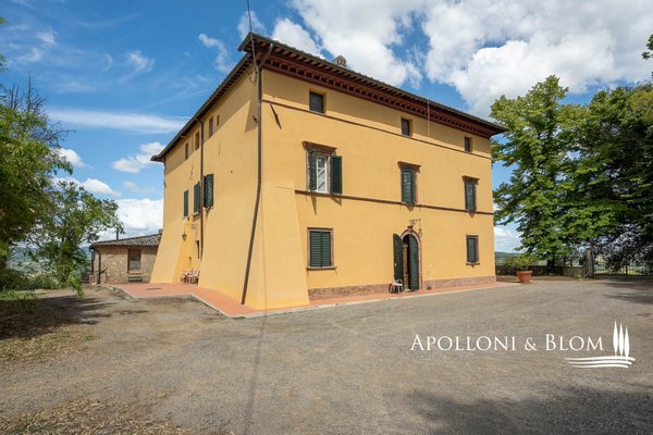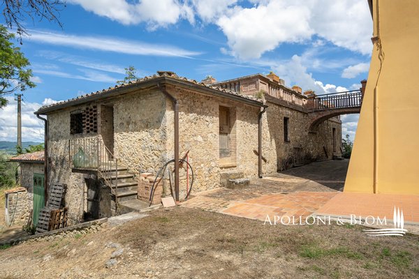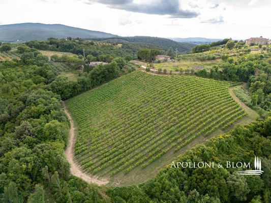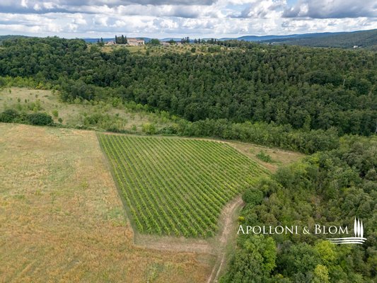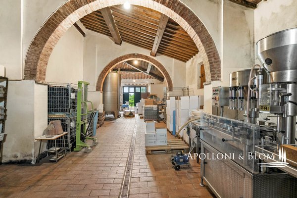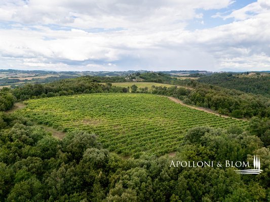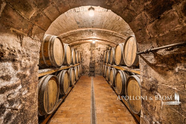 Einzigartige Gelegenheit im Chianti, in der Nähe von Siena, zu verkaufen Anwesen von über 200 Hektar mit Villa aus dem 18. Jahrhundert, Weinbergen und Weingut. In den Chianti-Hügeln zwischen der Stadt Siena und der Burg von Monteriggioni, nur 40 Minuten südlich von Florenz, 350 Meter über dem Meeresspiegel, dominiert die Villa Palazzetto eine bezaubernde Landschaft auf 205 Hektar Land mit den ersten Weinbergen aus dem Jahr 1970. Die Villa ist im perfekten Stil des 18. Jahrhunderts auf den Fundamenten einer mittelalterlichen Festung erbaut und erstreckt sich über drei Etagen mit Blick auf den Park. Steinverzierungen und Gesimse verleihen ihr einen eleganten Charakter, der typisch für die Landhäuser des sienesischen Adels ist. Das Innere kann sowohl als Privatresidenz als auch als Boutique-Hotel mit bis zu 8/10 Zimmern genutzt werden, alle mit großen Fenstern und Blick auf den Park und die Landschaft mit Dörfern, Wäldern und einzelnen Häusern. Das Eingangsfoyer und die Haupttreppe bieten Platz für den Einbau eines internen Aufzugs. Das Hauptwohnzimmer im ersten Stock zeichnet sich durch ein ganzwandiges Bogenfenster, einen Kamin und einen Zugang nach draußen mit einem überbrückten Durchgang aus, der zu einer großen Terrasse mit einer gemauerten Balustrade und einem offenen, herrlichen Panoramablick führt. Bei den jüngsten Renovierungen wurden die Dächer komplett neu gedeckt, die Fassaden verputzt, die Heizungsanlage mit einem Pelletkessel ausgestattet, zwei elegante Bäder im ersten Stock eingerichtet und die Zimmer mit Parkettböden versehen. Die große Terrasse ist das Dach des zweiten Gebäudes, das auf mehreren Ebenen angeordnet ist und dem Weinkeller gewidmet ist, mit verschiedenen Eingängen von außen, der jährlich etwa 30.000 Flaschen Chianti Colli Senesi DOCG und Toscana IGT produziert, die sowohl auf dem inländischen als auch auf dem ausländischen Markt verkauft werden. Die Weinberge, die sich in der Umstellung auf biologischen Anbau befinden und deren Zertifizierung für 2026 vorgesehen ist, umfassen etwa 14 Hektar, die hauptsächlich mit Sangiovese und Canaiolo bepflanzt sind, sowie einige Reihen mit Cabernet Sauvignon, Merlot und Syrah. Vom Keller aus führt ein Tunnel mit Steinmauern, der in der ersten Hälfte des 20. Jahrhunderts gebaut wurde und eine sehr eindrucksvolle Verbindung zu einer Höhle und einer Innentreppe herstellt, die direkt zur Villa führt. Es besteht die Möglichkeit, das Kellereigebäude in Wohnräume umzuwandeln und ein neues, separates Gebäude zu errichten, das als Weinkeller genutzt werden kann, um die Weinproduktion zusammen mit einem Teil des Ackerlandes, das in Weinberge umgewandelt werden kann, zu steigern. Strategische Lage auf dem Lande am Rande der Stadt Siena, eleganter Charakter mit einer über dreihundertjährigen Geschichte und einer langen Leidenschaft für die Herstellung toskanischer Rotweine.