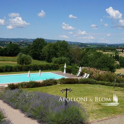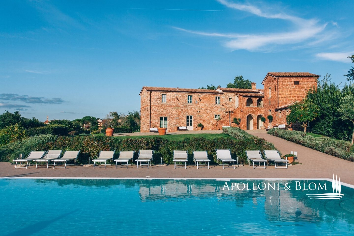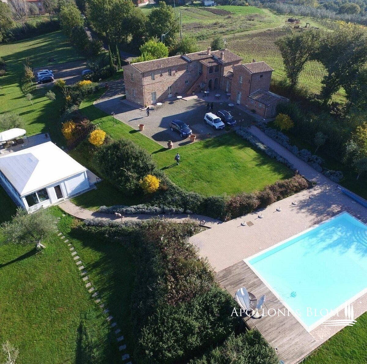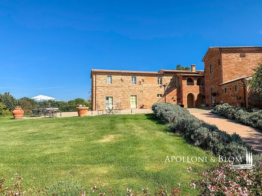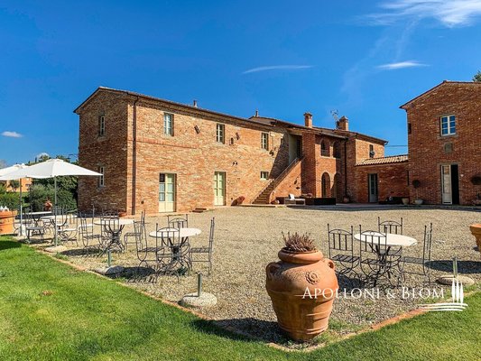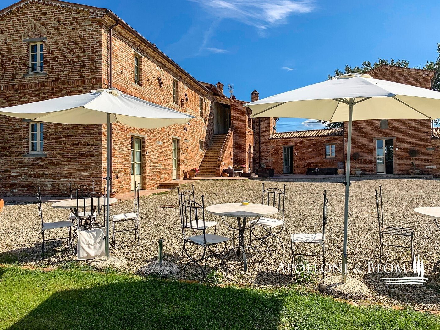 Sechzehnten Jahrhundert Bauernhaus mit Backsteinfassaden, gewölbte Loggia, renoviert mit neun Einheiten, Schwimmbad zu verkaufen in Foiano della Chiana, Arezzo. Das aus der Restaurierung eines Gebäudes aus dem Jahr 1500 stammende Casale Il Mattone Rosso verdankt seinen Namen den herrlichen Terrakotta-Ziegelfassaden, einem lokalen Handwerk, das im heutigen Mittelalter entwickelt wurde und heute eine restaurierte Residenz mit rustikalem toskanischem Charme bietet. Die doppelte Loggia mit vier Bögen ist das charakteristische Element des gesamten Gebäudes und überblickt einen klassischen Innenhof, der zu einem neu errichteten Schwimmbad, einer Sonnenterrasse und einem Panoramablick führt. Im Erdgeschoss befinden sich ein Aufenthaltsraum mit Rezeption und sechs Appartements mit einem oder zwei Zimmern, die alle einen eigenen Eingang vom Innenhof haben, sowie zwei weitere Einheiten im ersten Stock mit Zugang von der Loggia. Die Zimmer spiegeln den rustikalen toskanischen Stil wider und alle Suiten verfügen über einen Wohnbereich mit Küche und Klimaanlage. Im Untergeschoss befindet sich eine separate Wohnung für das Personal. Im Garten, mit herrlicher Aussicht, ein separater Bankettbereich mit professioneller Küche und Speisesaal für bis zu 40 Personen mit großen Fenstern und Zugang zu den Gartenterrassen mit Außenwohnbereichen. In schöner Lage im Val di Chiana, in der Nähe des historischen Zentrums, nur wenige Autominuten von Cortona, dem Trasimeno-See, Montepulciano, dem Bahnhof und der Autobahnverbindung nach Siena, Florenz und Assisi/Perugia entfernt. Casale Il Mattone Rosso ist bereit, bewohnt zu werden, um das ganze Jahr über mit Familie und Freunden zu leben oder als bereits etablierte Unterkunft für den Agrotourismus und als Ort für Hochzeiten und private Feiern.