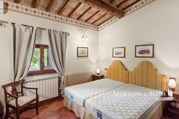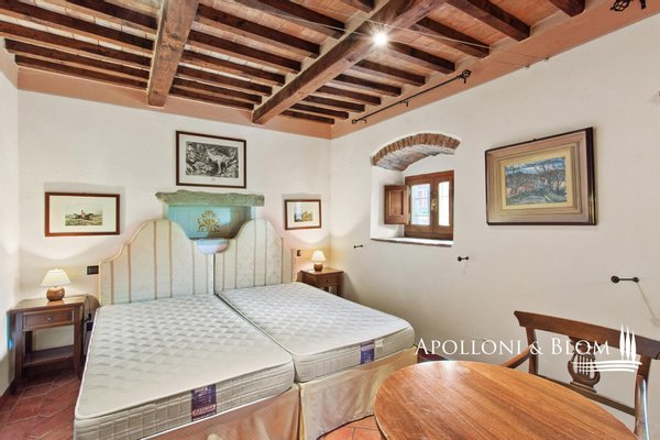 27-acre Bauernhof mit einem alten Kloster restauriert mit 14 Schlafzimmern, Restaurant, Spa mit Innenpool, Park mit Außenpool, Weinberg zum Verkauf in Cortona, Arezzo. An der Grenze zwischen Umbrien und der Toskana, nur 6 km von Cortona entfernt, eingebettet in das Val d'Esse und umgeben von Wäldern, befindet sich ein 27 Hektar großer Bauernhof mit Olivenhainen, Weinbergen, Weiden, Wäldern und einem Kloster aus dem Jahr 1500 mit eindrucksvollen und prestigeträchtigen historischen Elementen wie Natursteinfassaden, charakteristischen Fenstern und Türen aus antikem Holz, Innenräumen mit Kaminen, handgefertigten Cotto-Fußböden und Fresken an Wänden und Decken von Meister Eugenio Lucani und seiner Schülerin Silena Gallorini. Fachmännisch restauriert, wobei die ursprüngliche Struktur erhalten blieb, und in eine Residenz umgewandelt, die sich perfekt für die Bewirtung von Touristen und das Erleben des toskanischen Landlebens eignet, beherbergt sie einen Wohnbereich mit Restaurant und Pergola im Freien, ein Wellness-Center mit Fitnessraum und 8 Schlafzimmer in Einzel- oder Familiensuiten. Zwei einstöckige Cottages wurden mit sechs weiteren Suiten renoviert, die alle mit Wohnzimmern und Badezimmern mit natürlichen Oberflächen und Vollwandduschen ausgestattet sind. Das Gelände ist teilweise gepflastert mit Wegen und Treppen, die zu verschiedenen Ecken des Gartens führen, einem eleganten Glasbau mit einem beheizten Swimmingpool, einem Außenpool, einem Sportzentrum mit Geräten für Work Out und Cross Fit, einem Spielbereich für die Kleinsten und einem Gemüsegarten. Auf dem Gelände des Bauernhofs befinden sich verschiedene Schuppen, Lagerräume und Unterstände für Pferde und Nutztiere. Der Weinberg ist mit Sangiovese, Merlot und Syrah bepflanzt und in zwei getrennte Parzellen unterteilt, den historischen Weinberg und eine im Bau befindliche Neuanpflanzung. In bezaubernder privater Lage, nicht weit von allen Geschäften und Annehmlichkeiten entfernt, mit freiem Panoramablick, ist Convento Sofia ein charmantes Landresort mit Bauernhof, das viele gewinnende Elemente für die Ausrichtung von Veranstaltungen, Zeremonien und Ferien in der Ruhe und Stille der toskanischen Landschaft bietet. Eine Molkerei für die Verarbeitung von Schafsmilch ist in Planung.