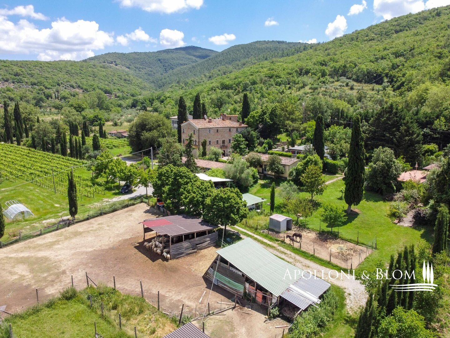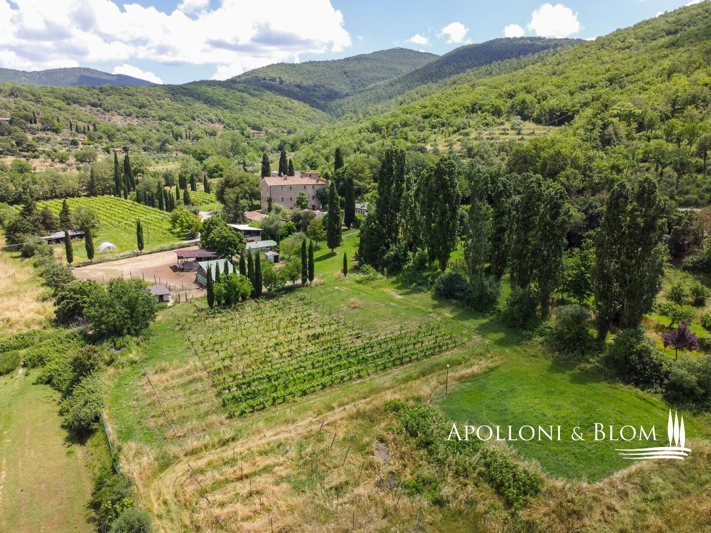Land: ca. 11 Hektar, davon 4 Hektar Olivenhain, 5 Hektar Park, Weide und Wald, ca. 1,6 Hektar Weinberg. Die Pflanzendichte pro Hektar liegt zwischen 3.900 und 5.000 Pflanzen. Beschneidungssystem Guyot, einfacher und teilweise gespornter Kordon. Die Reben sind hauptsächlich Sangiovese (84%), und zu einem kleinen Teil Merlot (8%) und Syrah (8%).
