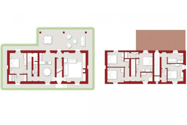 Erster Stock: 3 Doppelschlafzimmer mit eigenem Bad, 1 Doppelschlafzimmer, 1 Bad und 1 Einzelzimmer