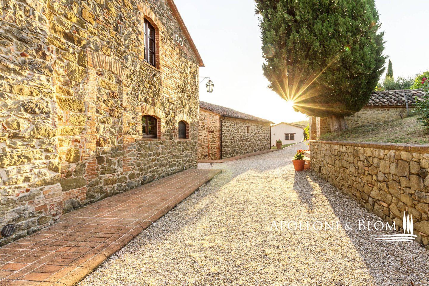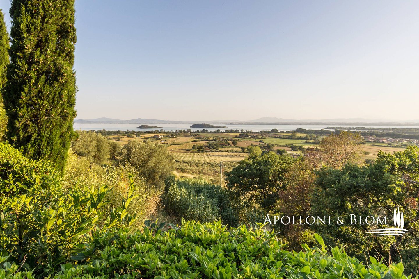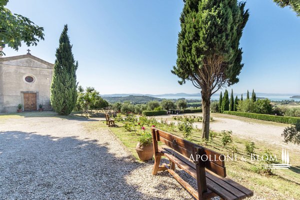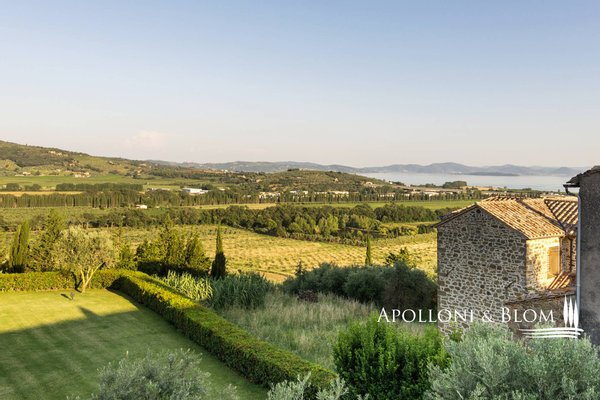Auf einem Hügel mit einzigartigem Seeblick, charmanter Weiler aus dem 17. Jahrhundert mit 31 Schlafzimmern, Schwimmbad und Park zu verkaufen in der Nähe von Tuoro sul Trasimeno, Perugia. Auf einem Hügel mit Blick auf den Trasimeno-See liegt ein klassischer Bauernhof aus dem 17. Jahrhundert, der einst zum Anwesen des Markgrafen Ranieri Bourbon di Sorbello gehörte, mit fünf Gebäuden, einer Kirche und einem Innenhof, der seit 1993 unter Denkmalschutz steht. Es wurde wunderschön restauriert und in einen Weiler mit 17 Ferienwohnungen und einem Festsaal für Feste und Empfänge umgewandelt. Im Garten befindet sich eine Aussichtsterrasse mit Blick auf den See, von der aus man spektakuläre Sonnenuntergänge genießen kann. In allen Gebäuden sind die ursprünglichen Steinfassaden und -mauern, Ziegelbögen und Holzbalkendecken erhalten geblieben, ein gemütlicher, rustikaler Stil mit Kaminen und alten, handgefertigten Möbeln. Die Wohnungen sind unterschiedlich ausgestattet und verfügen über ein bis drei Schlafzimmer, Kamine und voll ausgestattete Küchen, die sich perfekt für einen Urlaub mit Familie und Freunden eignen. Jedes Zimmer ist mit einer Klimaanlage ausgestattet. Im Außenbereich gibt es eine Tanzfläche, einen Swimmingpool mit Sonnenterrasse aus Terrakotta, einen Brotbackofen, einen Grill, einen Boccia-Platz und einen natürlichen Wanderweg durch jahrhundertealte Olivenhaine. Die Kirche, die sich noch immer im Besitz der örtlichen Diözese befindet und von Borgo Marchese für private Zeremonien genutzt wird, wurde im späten Mittelalter auf dem Grundriss eines lateinischen Kreuzes erbaut und bewahrt Gewölbedecken, Fresken mit Engeln, die Jungfrau Maria auf dem Hauptaltar, ein steinernes Taufbecken aus dem 19. Jahrhundert und einen Glockenturm mit zwei Bronzeglocken aus den Jahren 1480 und 1856. Strategisch günstig gelegen, nur wenige Minuten von Passignano, Tuoro und der toskanischen Grenze mit ihren faszinierenden historischen Stätten und Weinanbaugebieten entfernt.