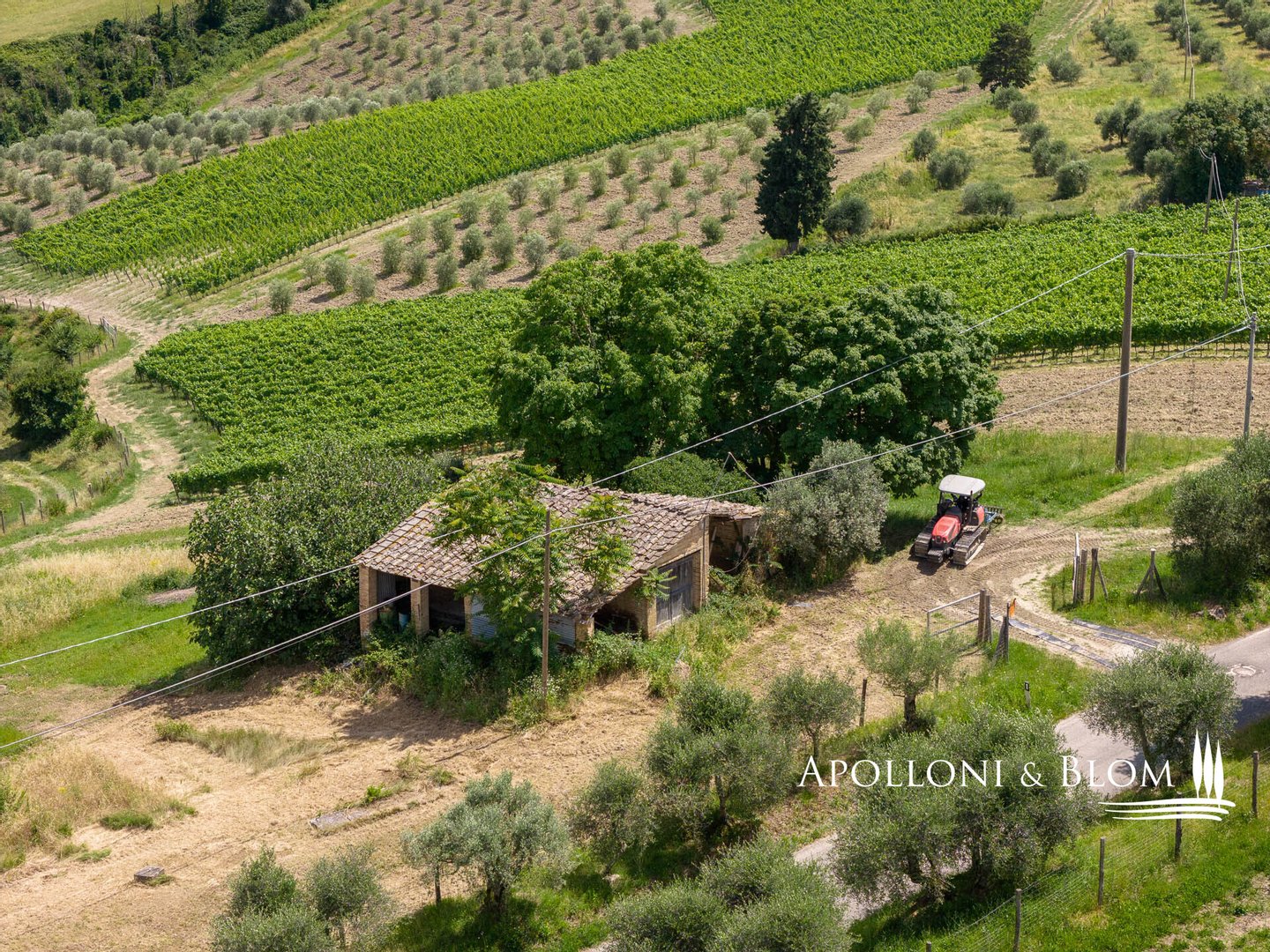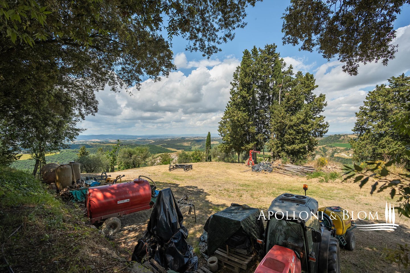 Land/Garten: 78 Hektar, davon 1,14 ha Ackerland um die Gebäude herum, 4,8 ha Weinberge (+0,4 neue Pflanzrechte) und 3,8 ha bereits eingezäunter Olivenhain, 17,8 ha Ackerland, das teilweise in Weinberge umgewandelt werden kann, 3,5 ha Trüffelanbaugebiet, 37 ha Wald, dazu Obstgärten, Wassergräben und 10200 qm Seen und Teiche
