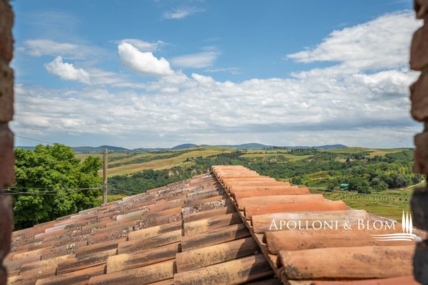 Einzigartige Aussicht, zu renovierendes Bauernhaus mit Weinkeller, alte Bauernhäuser, Trüffelreservat, Weinberg und Olivenhain zu verkaufen in Siena. In einer der faszinierendsten Landschaften der Crete Senesi südlich von Siena, an der Grenze zum Val