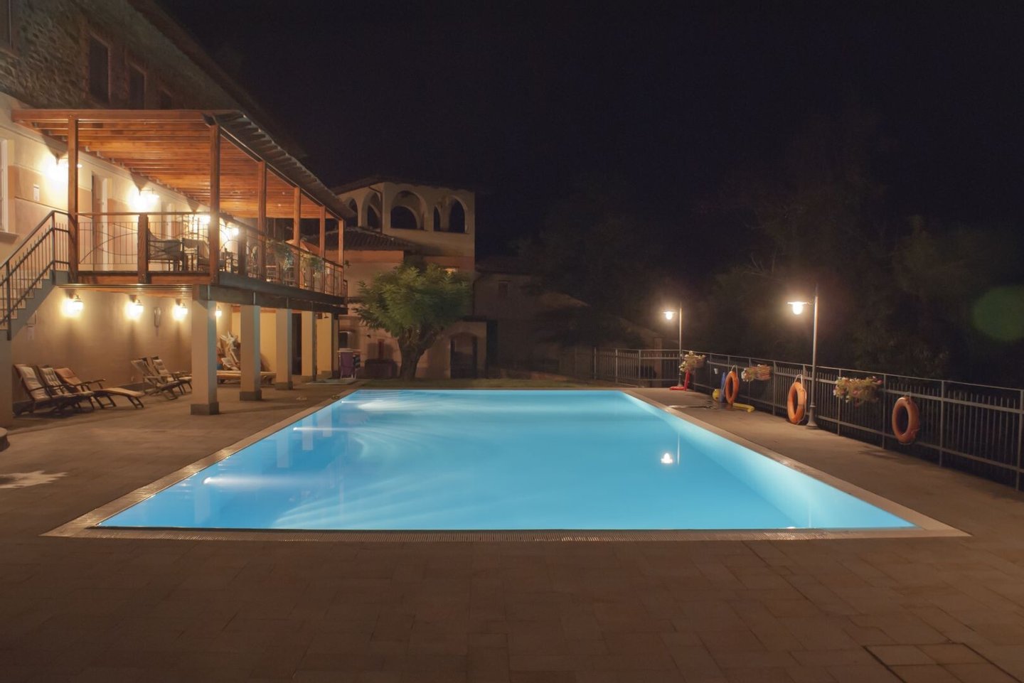 Art: insgesamt 2200 Quadratmeter: Unterkunftsgebäude (B&B) von ca. 1050 Quadratmetern, verteilt auf zwei Ebenen, plus freistehendes Haus von 267 Quadratmetern, verteilt auf drei Ebenen, und Keller von 429 Quadratmetern, verteilt auf zwei Ebenen, Schuppen von 448 Quadratmetern, Grundstück und Schwimmbad