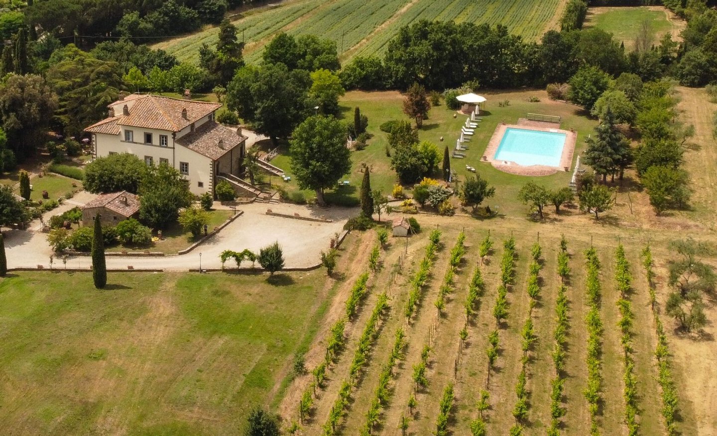 Land/Garten: ca. 5,5 Hektar, davon ca. 4 Hektar Ackerland, 0,8 Hektar Olivenhain mit ca. 12 Olivenbäumen und ca. 1 Hektar Weinberg (Sangiovese) - Übungsgolfplatz mit 1 Loch